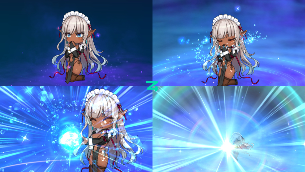 ▲奥義・メイドさんより真心をこめて。跪いて涙を流すエレオノール。その涙が空中を漂って彼女の手の中に集まり、眩しく光を放つ