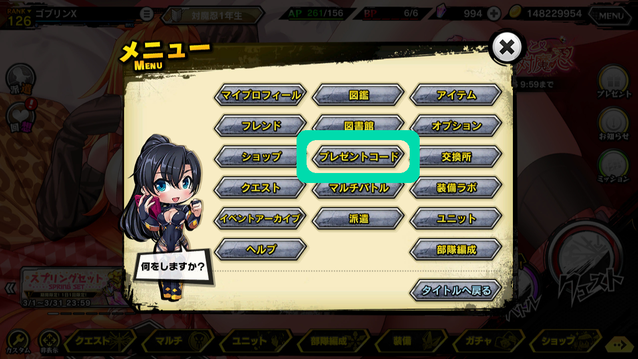 ▲プレゼントコード入力は、メニューの"プレゼントコード"から!!