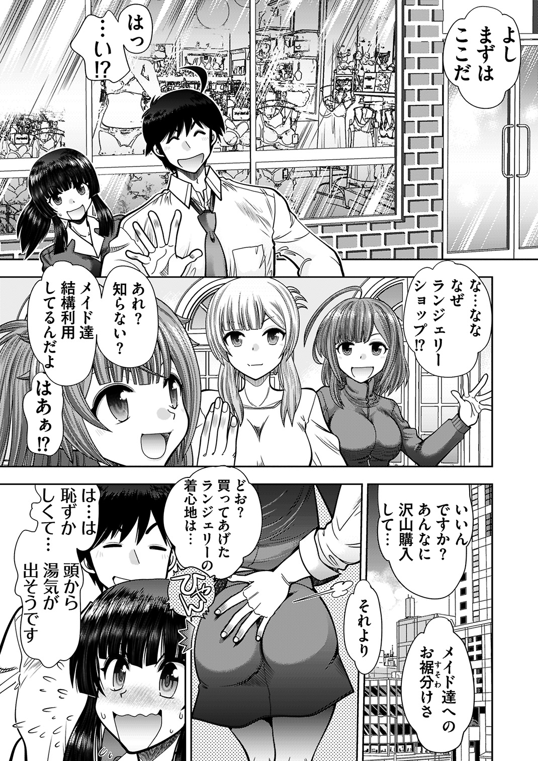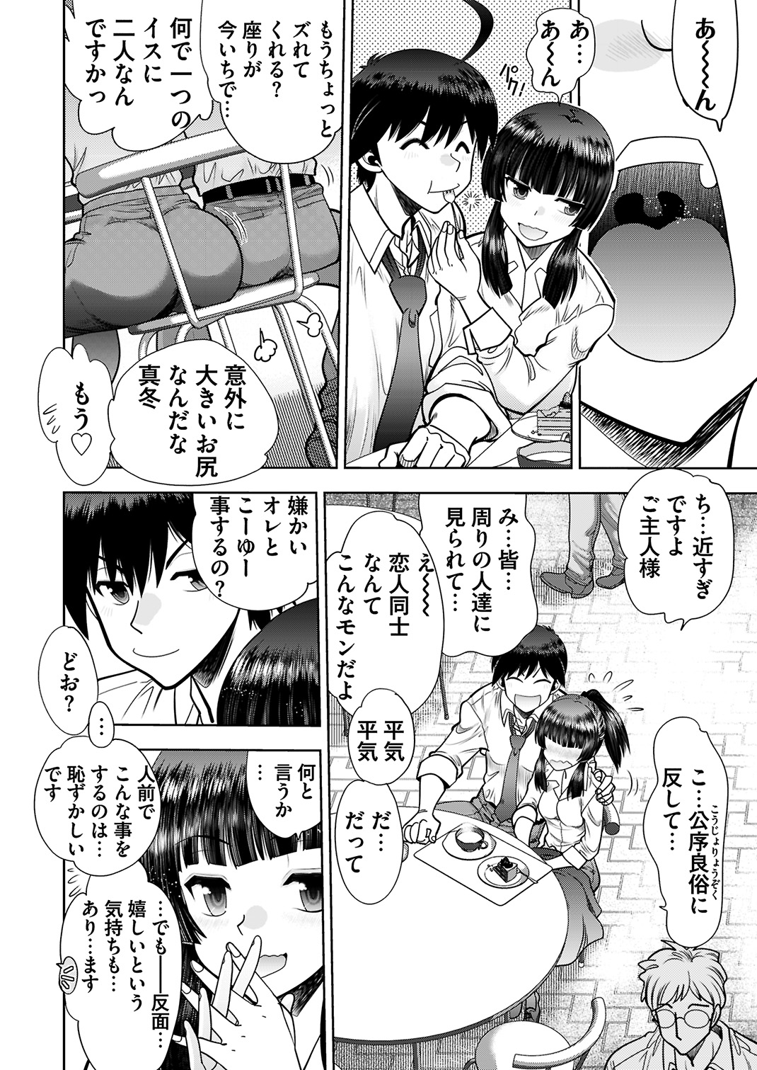 羞恥心が強いせいで、お客様に粗相をしてしまった真冬。そんな彼女の性格を矯正しようと、主人公はデートに誘う事に。まずは2人でHな下着を購入したり、他の人に見せ付けるようにイチャイチャしたり。さらには人気のないところに彼女を連れ込み、先ほど買ったエロ下着姿にさせてしまう。興奮した主人公は、恥ずかしがる真冬の前で勃起チ◯ポを晒すのだった。
