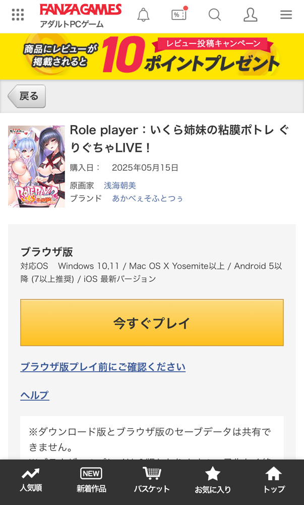 ▲作品ページに飛んで「今すぐ購入する」ボタンをタップ。プレイ環境の確認は忘れずに