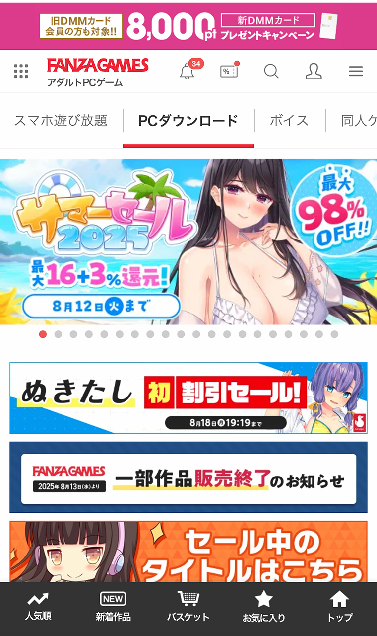 ▲まずはブラウザでFANZAの「PCゲーム」トップ画面を開く。右上の虫眼鏡アイコンから作品を検索だ。総合トップ画面で検索してもOK