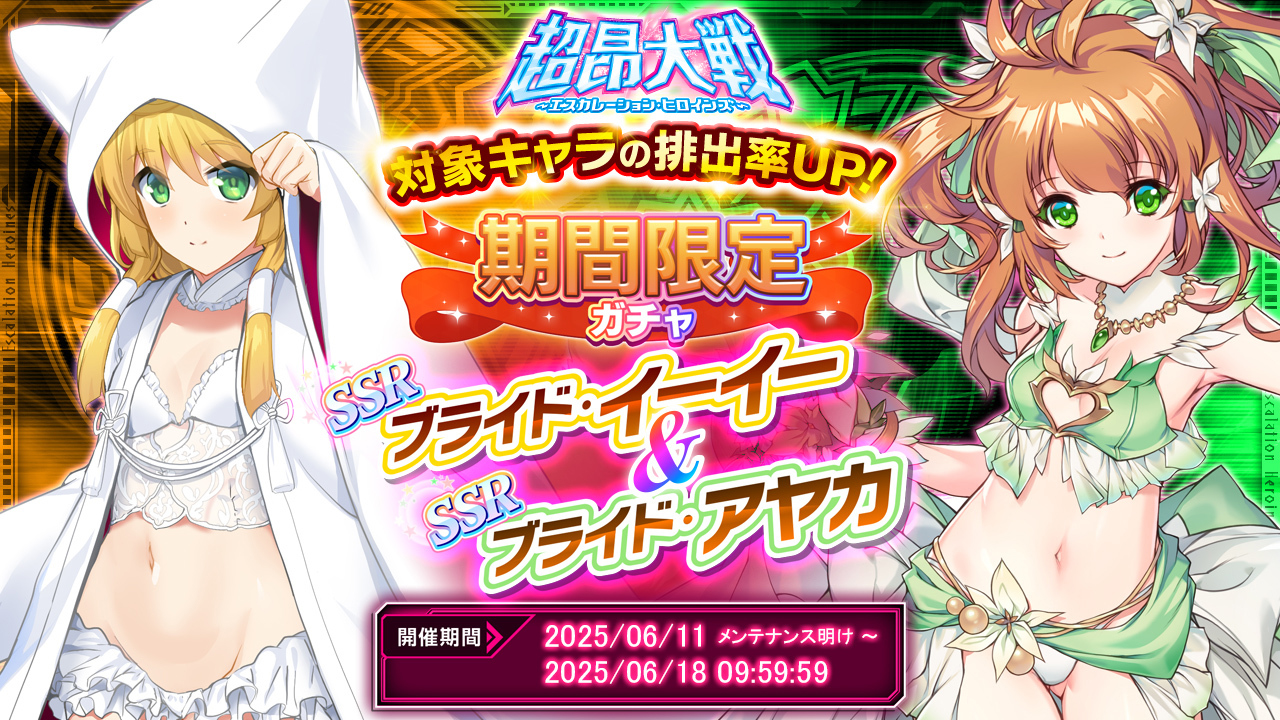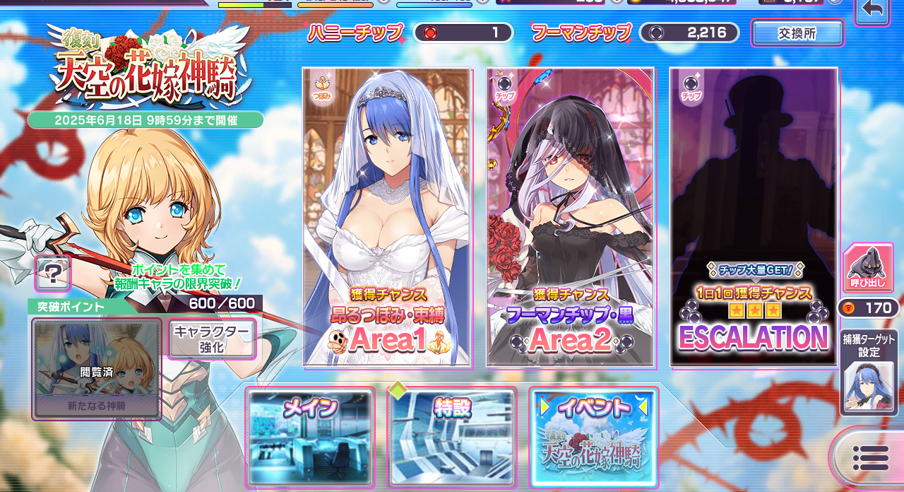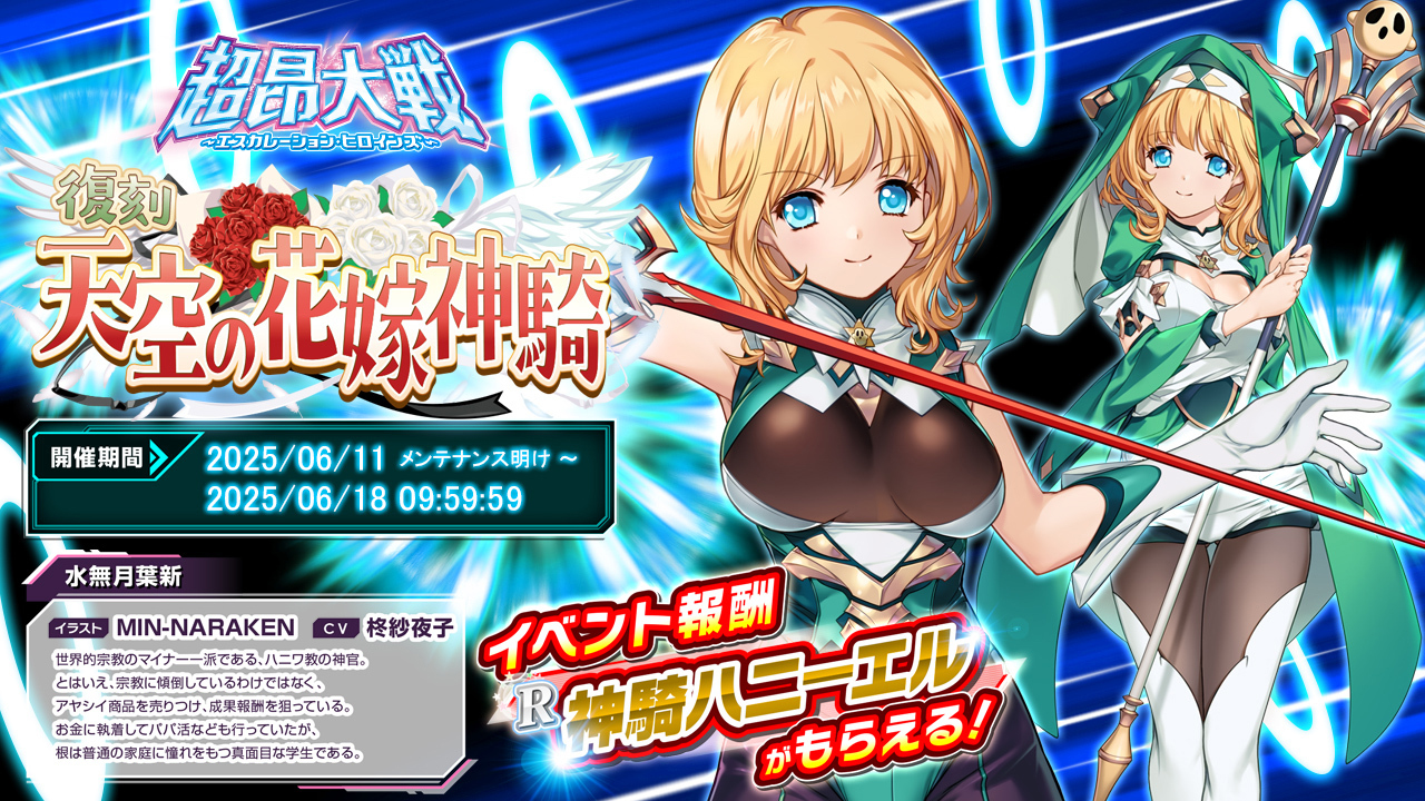 『超昂大戦 エスカレーションヒロインズ』は現在、復刻ブライダルイベント『天空の花嫁神騎』が開催中。こちらは昨年に行われたもので、イベント報酬はRキャラである神騎ハニーエルとなっている。