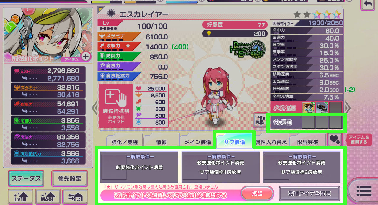 ▲下段、グレーの「サブ装備」枠の拡張は、「強化/覚醒」や「限界突破」ではなく「サブ装備」タブから行う