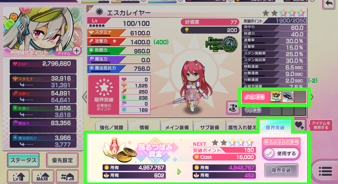 「メイン装備」枠は、初期状態では上段の左端1つしか使えない。キャラクターの「限界突破」によるランクアップでランク3になると+1枠で合計2、ランク5で「メイン装備」が+1枠で合計3枠が使えるようになる。装備は多く持たせるほど強くなるので、キャラクター育成の際には“ランク3で装備枠+1する”ことを優先的に行うのはセオリーといえるだろう。