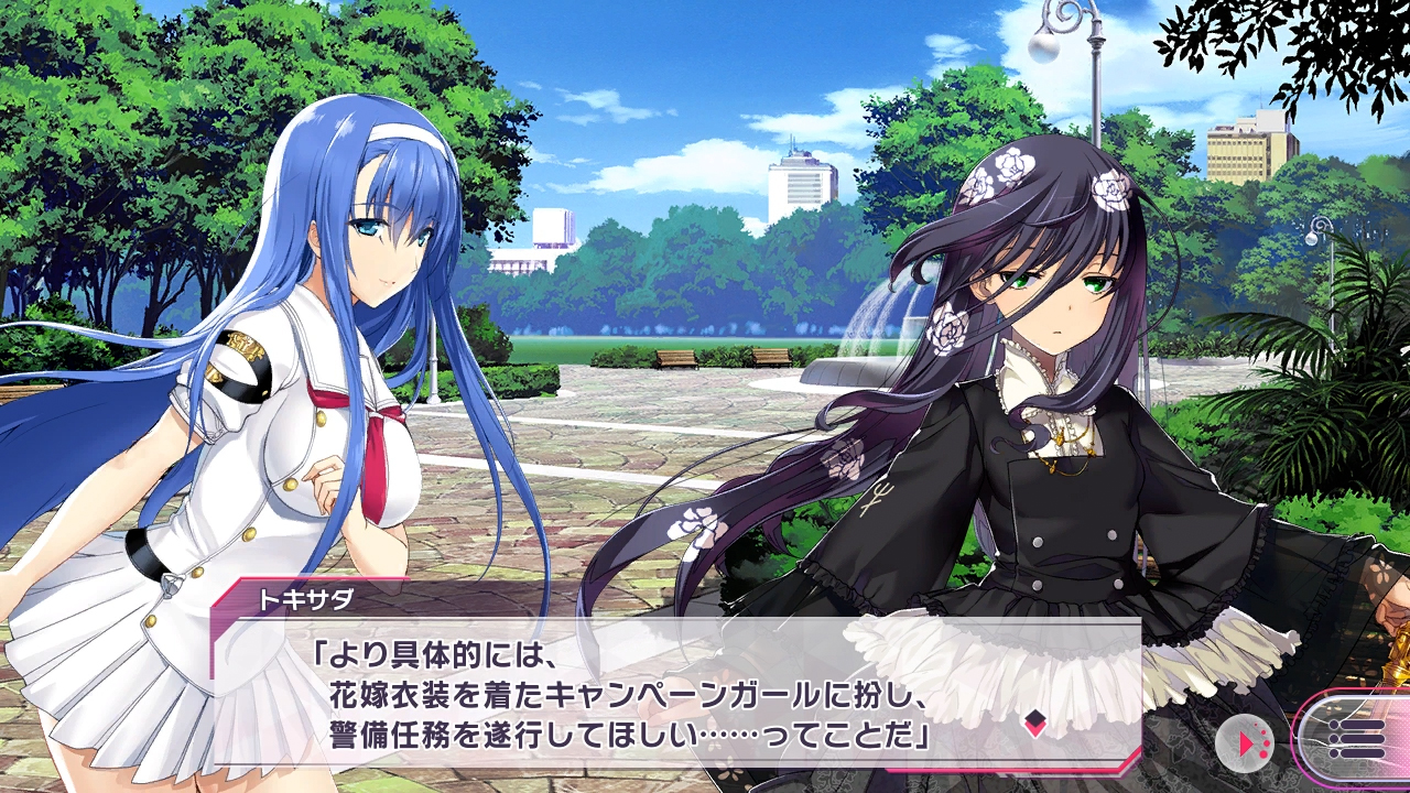 花嫁衣装に身を包んだエリスたちはキャンペーンガールに扮し現場警備にあたる。