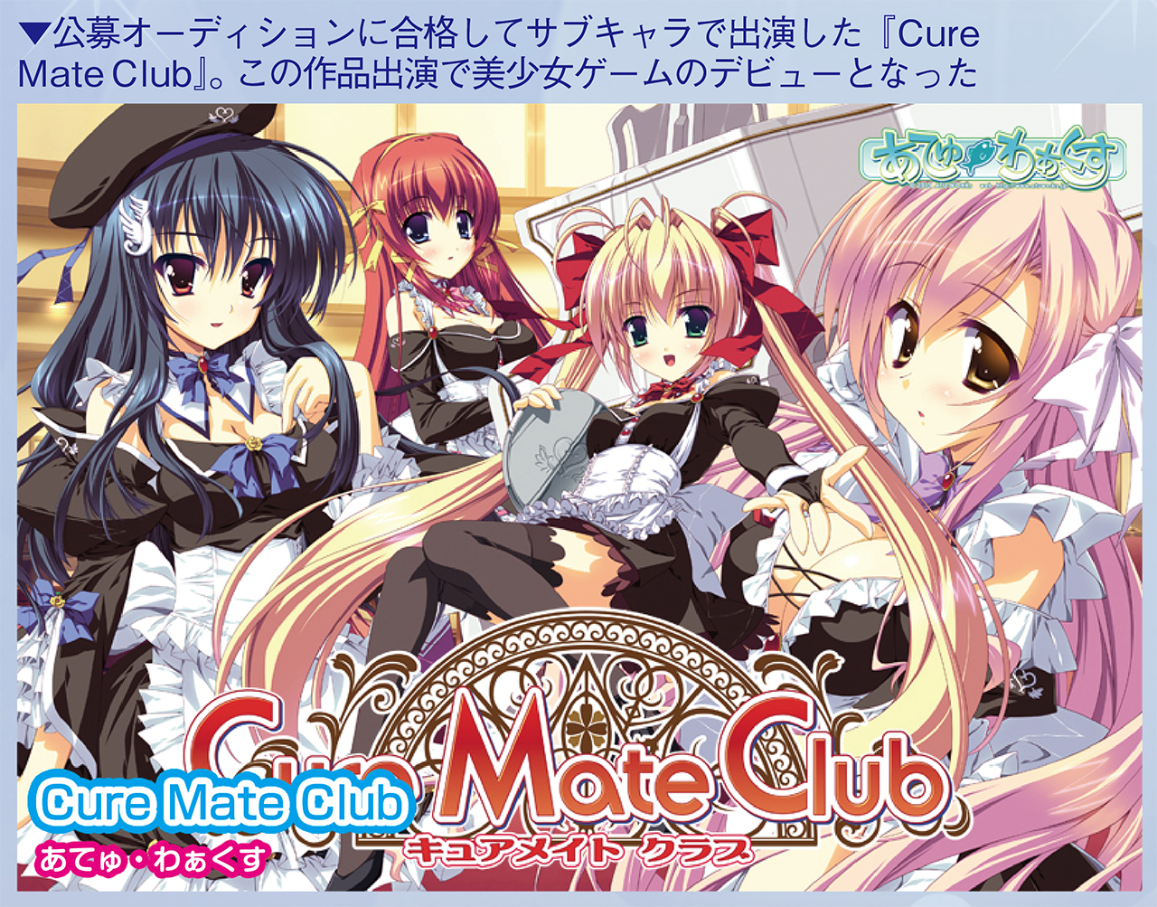 橘:いえ、実はデビューはワークショップに通う前です。当時は美少女ゲームメーカーさんが声優オーディション参加者を公募していることが多くて、知り合いに紹介されて受かったのが、『Cure Mate Club』(あてゅ・わぁくす)だったんです。