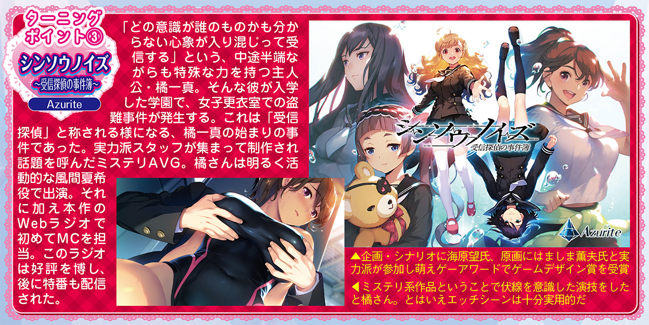 橘:2015年のインタビュー以降ですと『シンソウノイズ ~受信探偵の事件簿~』(Azurite)。この作品はWebラジオがあったじゃないですか。一緒にMCを担当したくすはらゆいさんとはこの作品で仲良くなって、後に『CLIP☆CRAFT☆らじお』も一緒にやらせてもらうんですが、人間関係が大きく広がりました。体験版実況をやったり、イベントにも参加したりと、思い出の多い作品です。