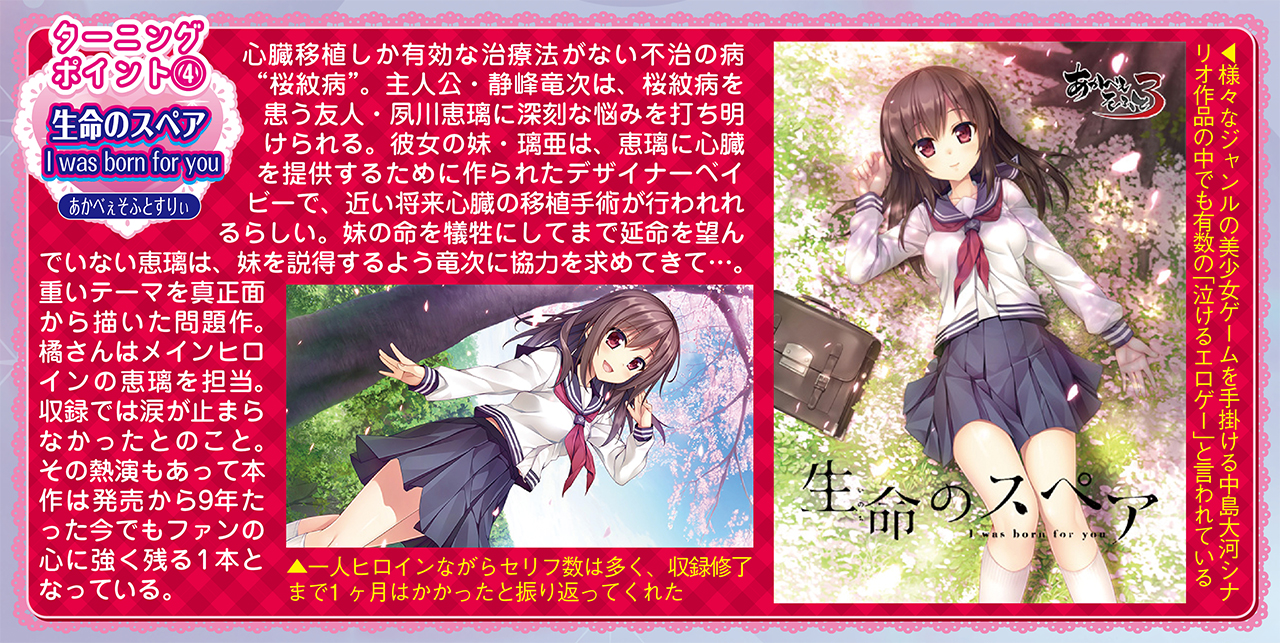橘:ちょっと遡ってしまうんですが、2016年に発売された『生命のスペア I was born for you』(あかべぇそふとすりぃ)かな。実はあかべぇそふとさんの作品はこれが初めてだったんです。それで単独ヒロインなのでゲーム内のボイスの8割くらいが私の声なんです(笑)。キャラとしても内容も印象に残っているんですよね。私、泣きの芝居と笑いの芝居だと泣きの方が得意なんですけど、この作品はボロボロ泣きながら収録していました。