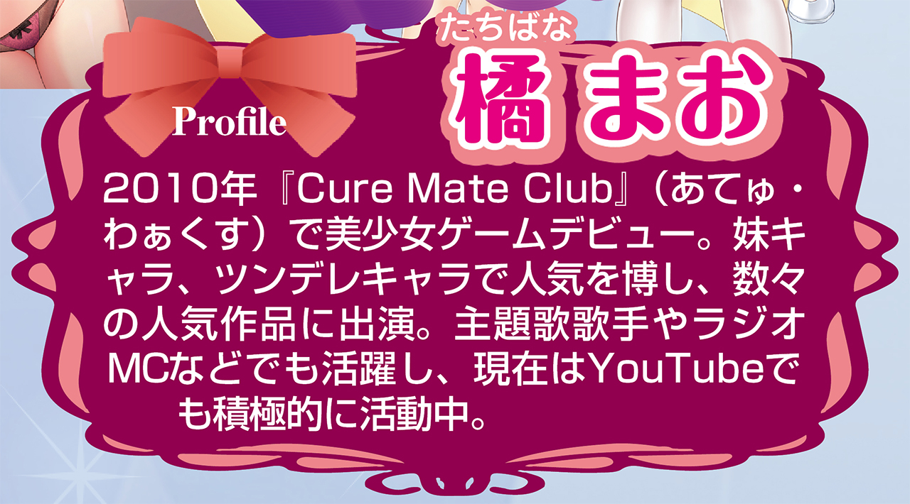 橘:で、これは言うといつも驚かれるんでが、養成所では洋画の濃厚キスシーンみたいなレッスンもあったんですけど、それがイヤで(笑)。だから「エロゲーってどんなことまでするんだろう」って不安でした。でも『Cure Mate Club』ではサブキャラということもあって、そういうシーンはなかったんですけどね。