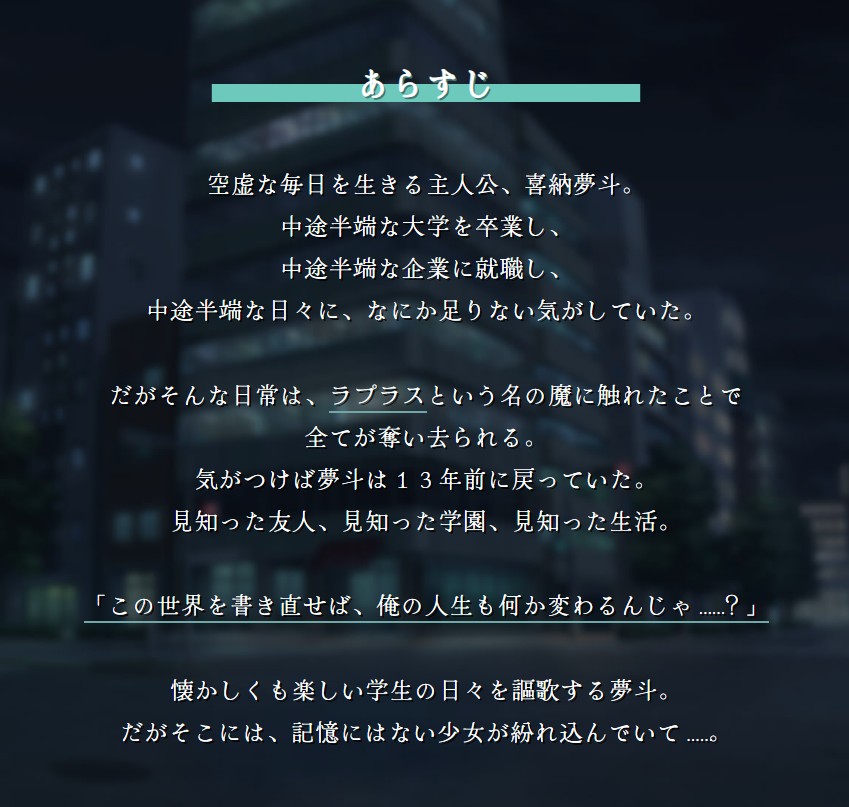 中途半端な人生を送っていた主人公は、ラプラスという名の魔に触れたことで13年前にタイムスリップしてしまう。鬱々としていた自身の未来を変えるため、再び訪れた学生時代を謳歌しようとする。だが、再び訪れた13年前は以前とまったく同じ13年前ではなかった。主人公の記憶にはない、蝶舞 翠(ちょうまい すい)という少女が紛れ込んでいたからだ──。