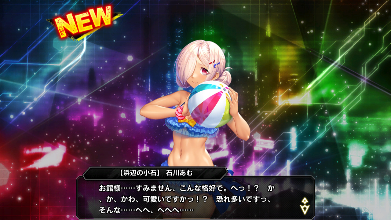 ▲イベント報酬はSR【浜辺の小石】石川あむ。この前のレイドイベント"女教師南海大作戦"で東南アジアに出張していた小太郎たちは、そのままリゾート地で休暇に入っている。あむも一緒にいて、水着でのんびり遊んでいる状態だ