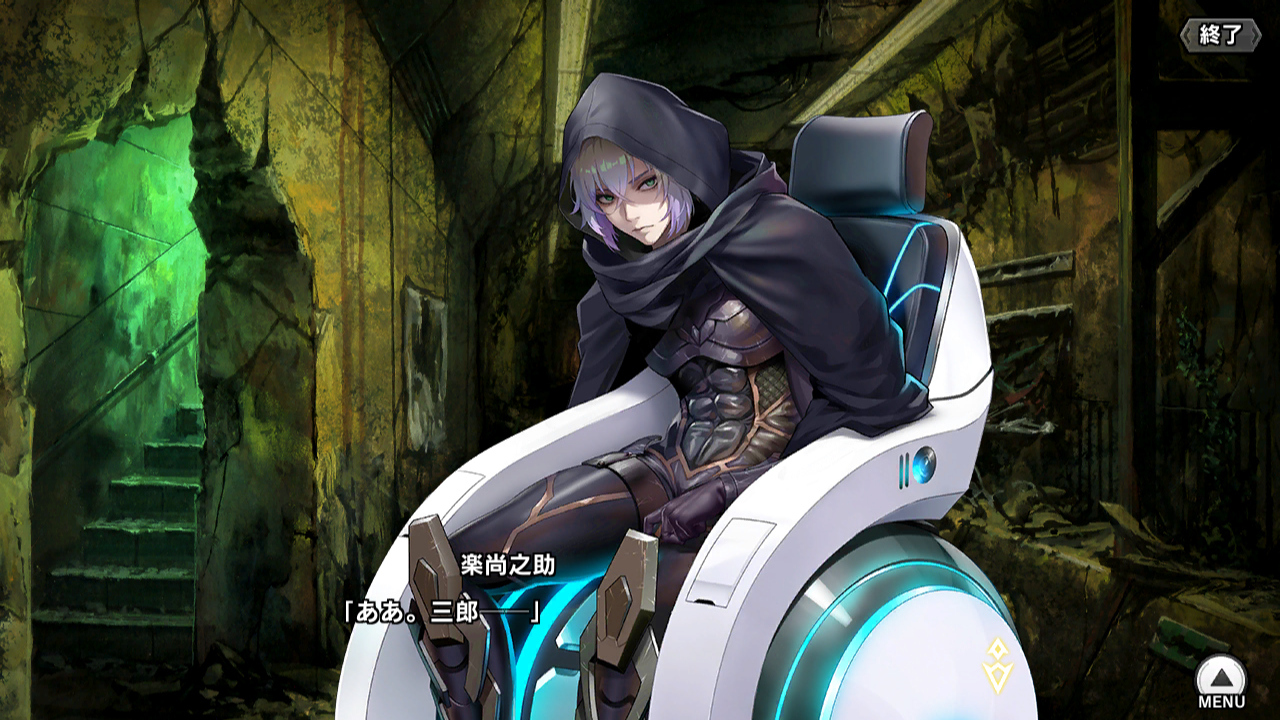 ▲もう一人、生き延びてしまった楽尚之助は、死霊卿に捕えられていた際に受けた拷問のせいで車椅子生活である。三郎と二人、アミダハラで静かに暮らそうと思っていたが、三郎の考えを尊重してさざれ旅団を結成。自分が団長に、三郎が副団長になって活動している