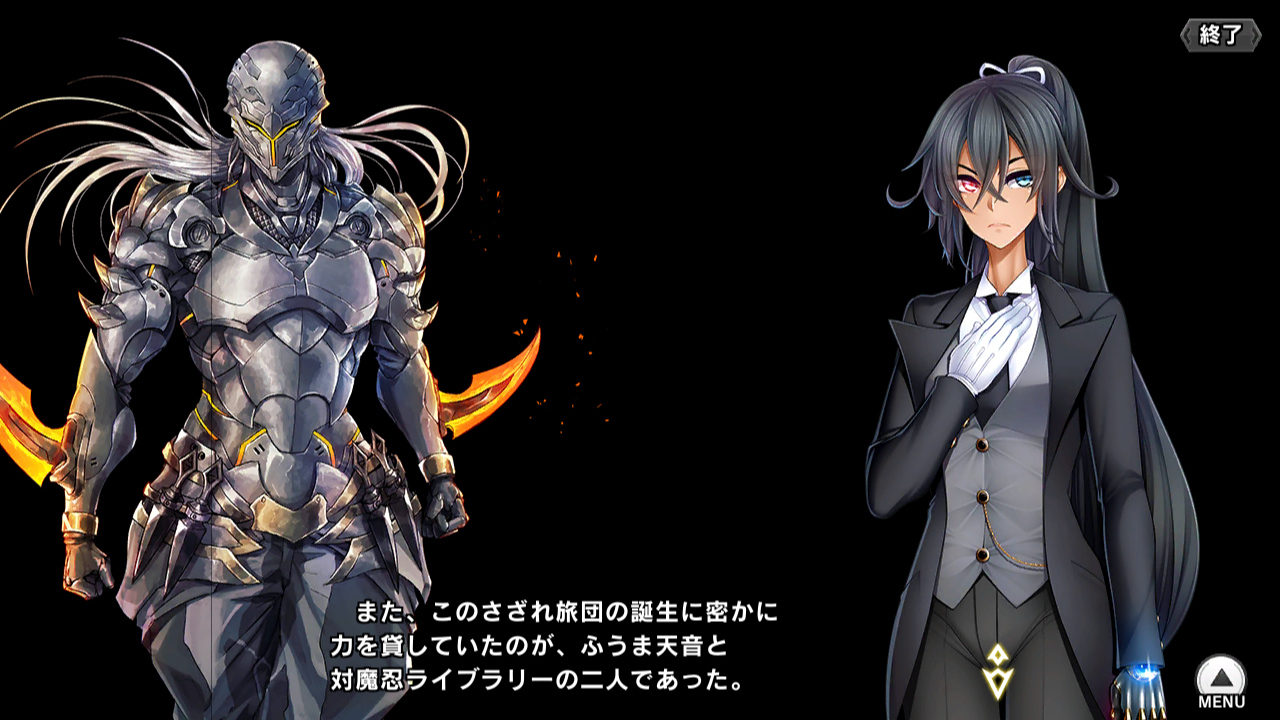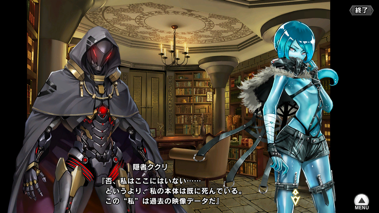▲空間の主はストーリーイベント"文香とフェリシア"に登場した謎のブレインフレーヤー(多分)の隠者ククリだった。つまりトラップは魔術ではなくブレインフレーヤーの謎テクノロジーなのだが、まぁ人間に区別はつかない。彼は侵入者を排除しようとするが、お諒がどこでもドアでリゾート地(ククリがバカンスに行きたい時用)に飛んで行ったり、いろいろあって戦意をくじかれ、ローレライに金を払って手打ちにする。三郎にも何かをくれたようだが、何をくれたかは不明
