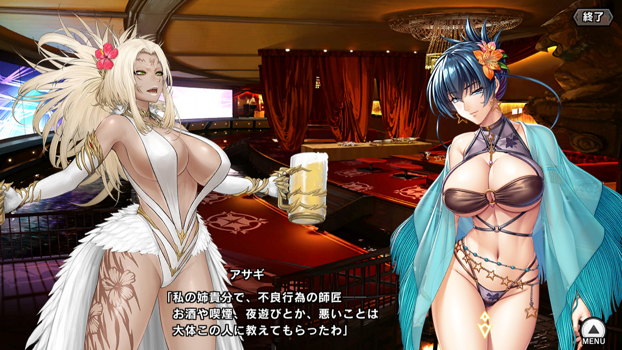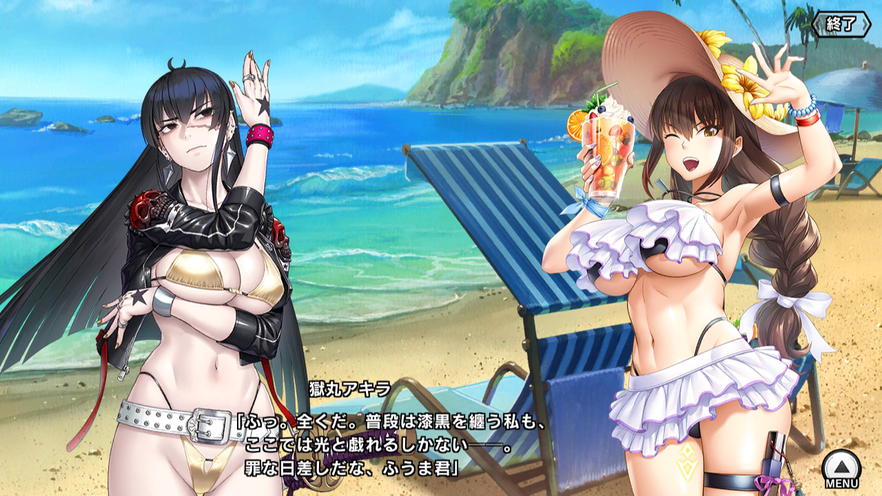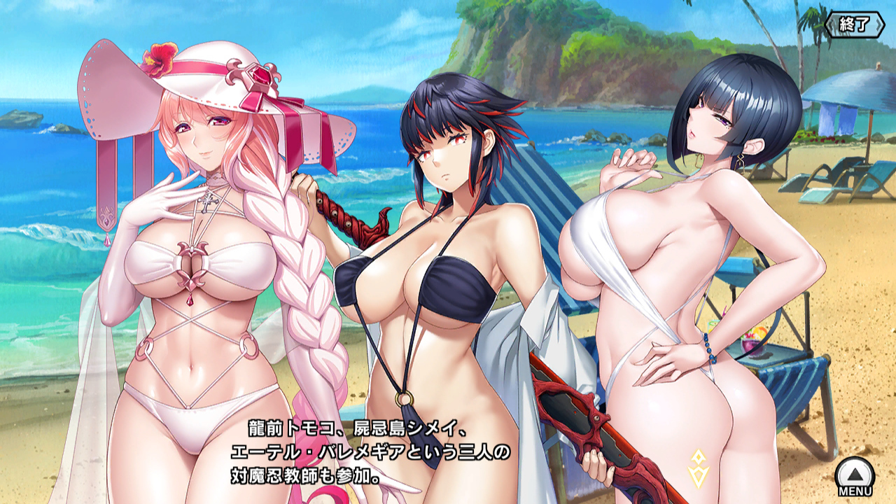 ▲ところ変わって、任務ついでのバカンス中な小太郎たち。アキラと深月の水着は新ユニットとしてガチャに追加されている。対魔忍は露出に対する感性がちょっと違うのか、みんな着ている水着が過激である。メンバーがメチャクチャなのだが、あまり他人に干渉しない内向きの変人が揃っているせいか雰囲気は悪くない。深月はなんか変人に慣れている