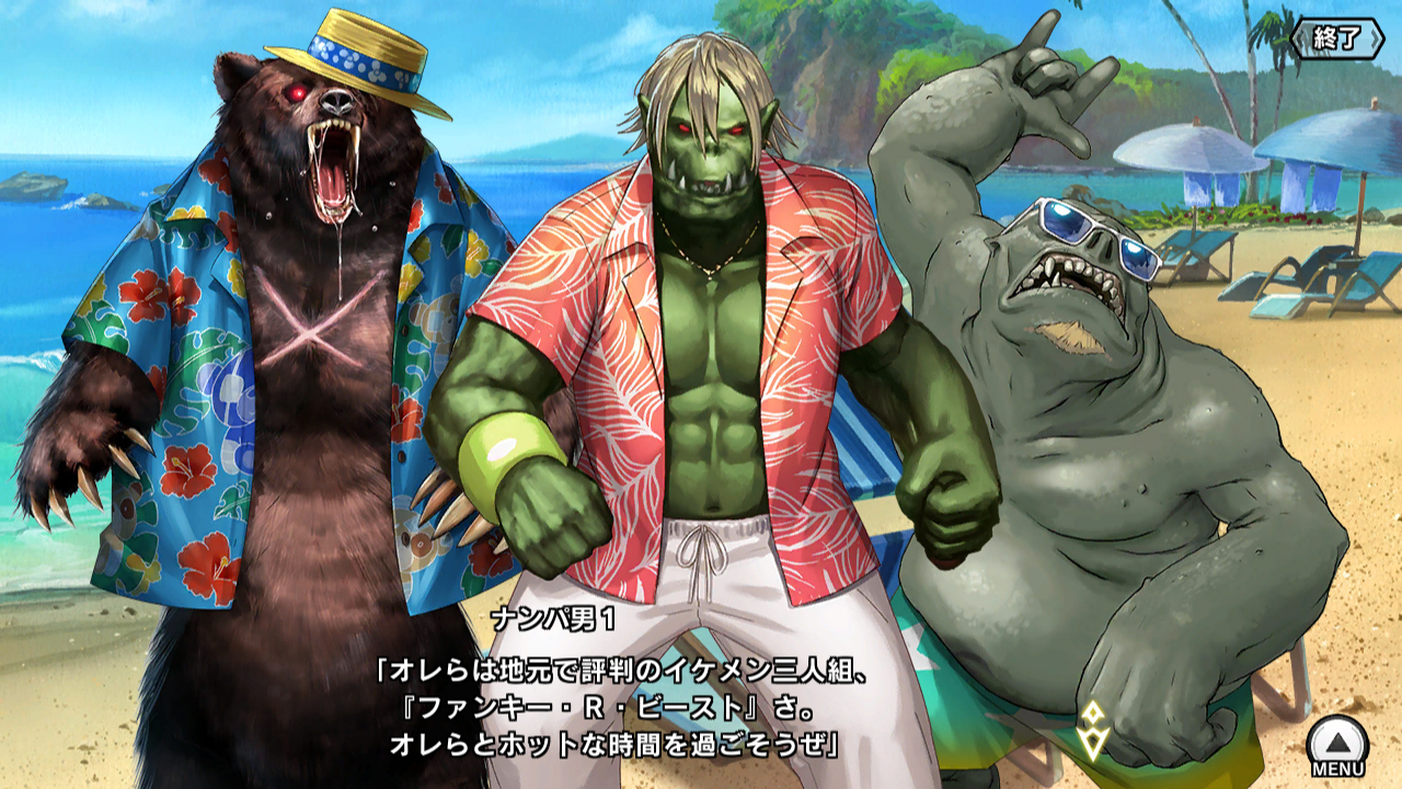 ▲お諒好きなので、おまけのグラフィック紹介。これはSR【水着】人外のお諒の差分立ち絵。差分として収録されているが、まったく別の絵になっている。途中で出てくる忌子のバージョンが元のユニットイラストだ。よく見ると服装は同じなのだが、人間形態の時はチャックを開けている。イベントアーカイブに収録されているマップイベント"魔王の娘とビーチ"で入手可能。欲しい人はたまにアーカイブ全開放があるので、その時に入手するといい
