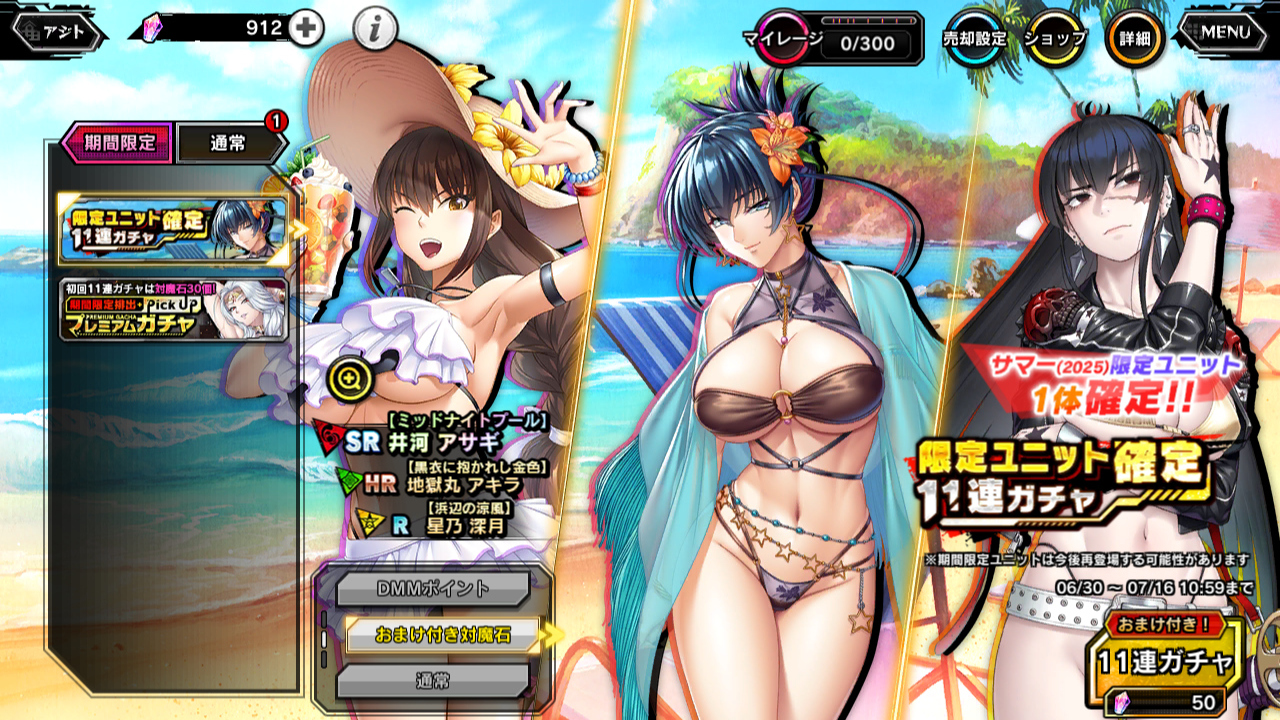 ▲限定なので、いつものおまけ付き限定ユニット確定11連ガチャがある。まずはこれから。アサギさん、ホワイトブロッサムから「年も考えず攻めた水着」とか言われていたが、よくお似合いですよ。アキラはなんで金ビキニなんだ、何を見た?