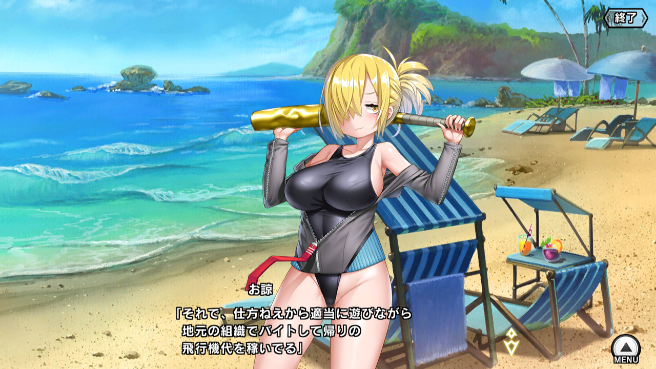 ▲メニューの下のアジト画面は、お諒とビーチ。休暇で遊びに来た静流先生ものんびり寝ている