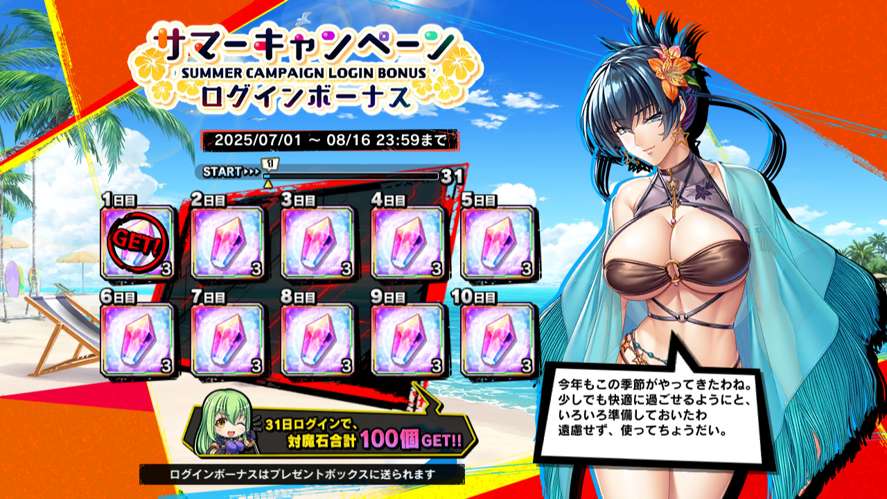 ▲イベントのほかに、2025サマーキャンペーンとしてログインボーナス、ユニット経験値・信頼度・ランク経験値クエスト、デイリークエスト全開放なんかが開催中。ログインボーナスではアサギさんが対魔石を100個くれる