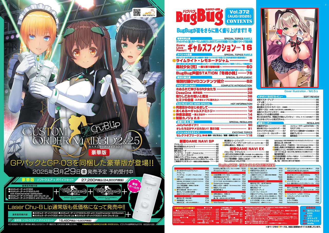 関連記事 夏休みはエロゲで大バズリ!! ゆずソフト最新作を筆頭に人気ブランドの最新作をたっぷり紹介♪ 『BugBug』8月号は本日発売!! 夏休み商戦を目前に控え、人気ブランドの新作が続々発表。激アツ情報満載で ... 注目の最新美少女ゲーム情報をスマホやタブレットで手軽にチェック☆ BugBug7月号の電子書籍版は本日発売!! 電子書籍版には付録のDVDは付いてないけど、税込1,100円と紙の本より安価でお得。電子 ... パソコンやスマートテレビの大画面で大判リニューアルした誌面を迫力満点で味わうのもアリ♪ BugBug6月号の電子書籍版は、毎月10日の本日発売!! 紙版は4月号よりA4サイズに大っきくリニューアルして ... コスパ抜群な電子書籍でお手軽に最新美少女ゲーム情報を満喫しよう BugBug5月号の電子書籍版は本日発売!! 紙版は先月の4月号よりA4サイズに大っきくリニューアルして大好評!! 営業部に売れ行きを確 ... 大判化して1ページ当たりの情報量も増加!! いつでもどこでも最新美少女ゲーム情報を楽しんじゃおう♪ BugBug4月号の電子書籍版は本日配信!! 紙版はA4サイズに大っきくリニューアルして1ページに情 ... スマホやタブレットでいつでもどこでもお手軽に最新美少女ゲーム情報をGET!! BugBug3月号の電子書籍版は本日配信!! 電子書籍版には付録のDVDが付いてないけど、かわりに税込1,100円と紙の本 ... 電子書籍版なら紙版より税込で780円も安価にゲットできる!! BugBug2月号の電子書籍版は本日発売!! 今月は新春特大号として、紙版にはいつものDVDに加えてもう一つ「BugBug2025カレンダ ...