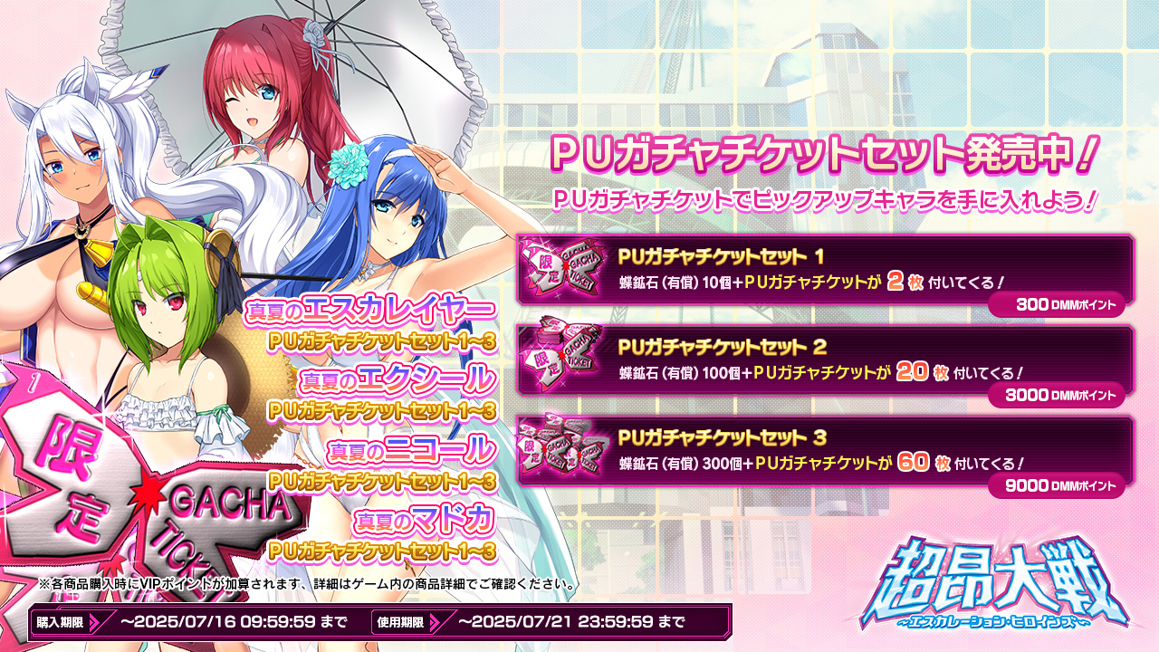 ショップでは定番のPUガチャチケットセットが販売中。基本、購入してすぐ使うものだが、一応使用期限は7月21日いっぱいとなっているので注意しよう。