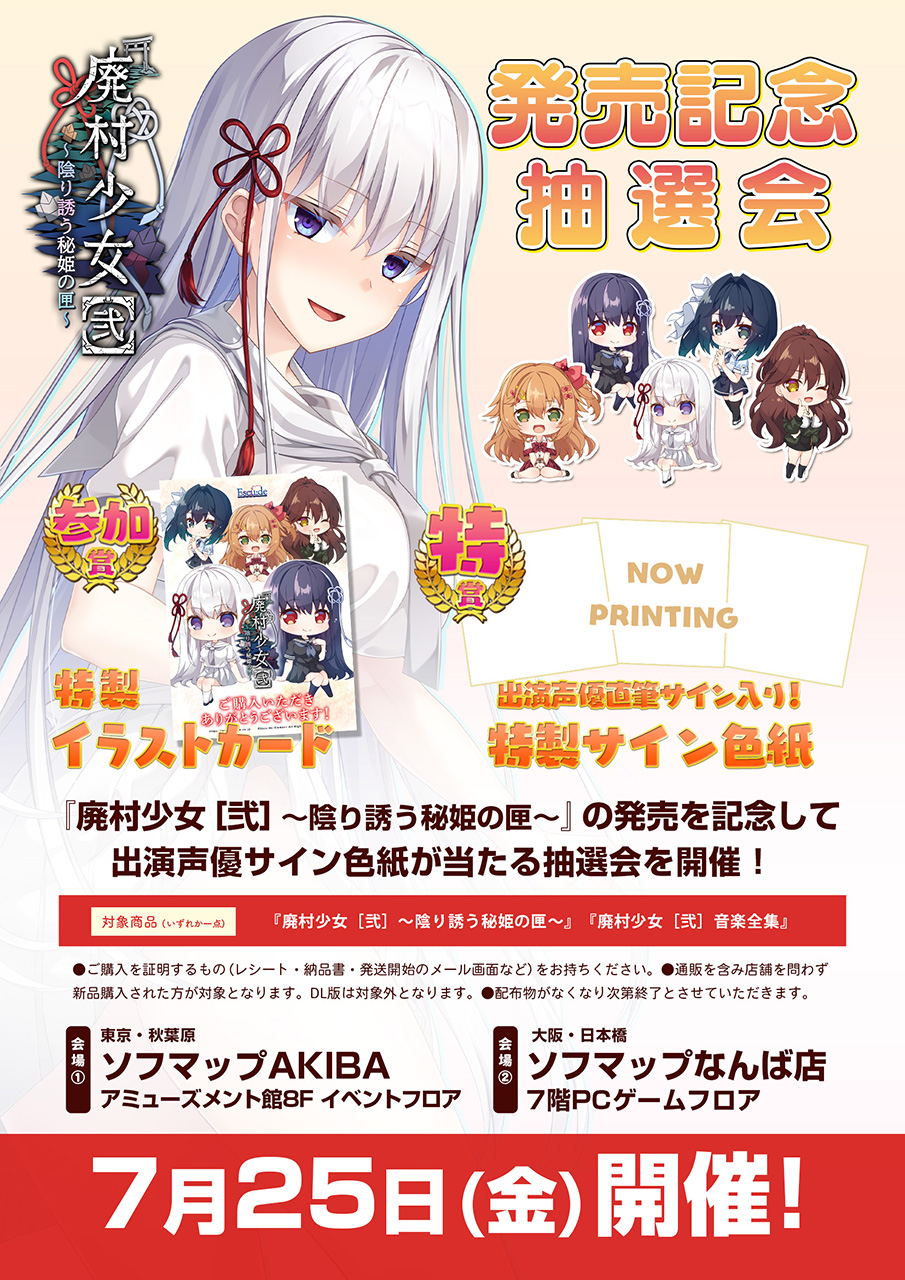 そしてサントラである『廃村少女[弐] ~陰り誘う秘姫の匣~ 音楽全集』は、ゲームと同日の7月25日発売で、作中のBGMやボーカル曲を含み全24曲収録したアルバムとなっているぞ。