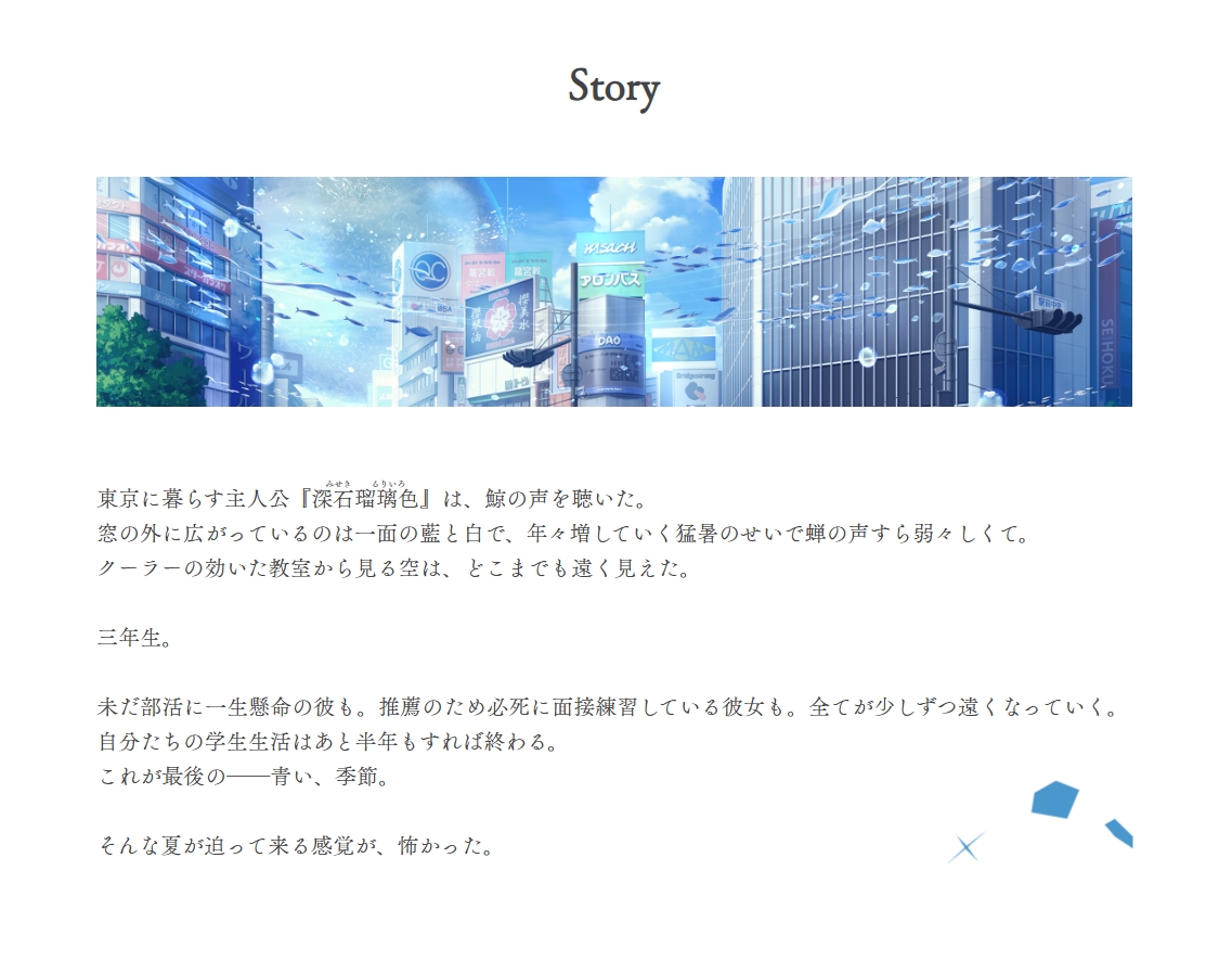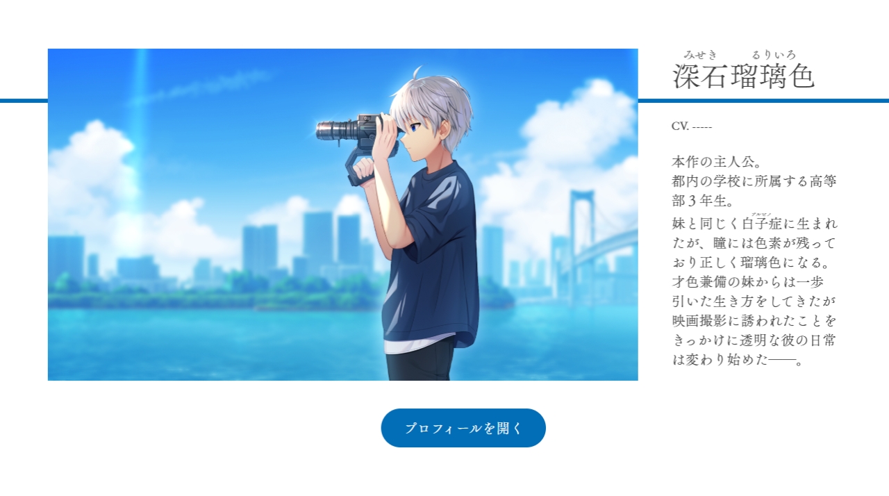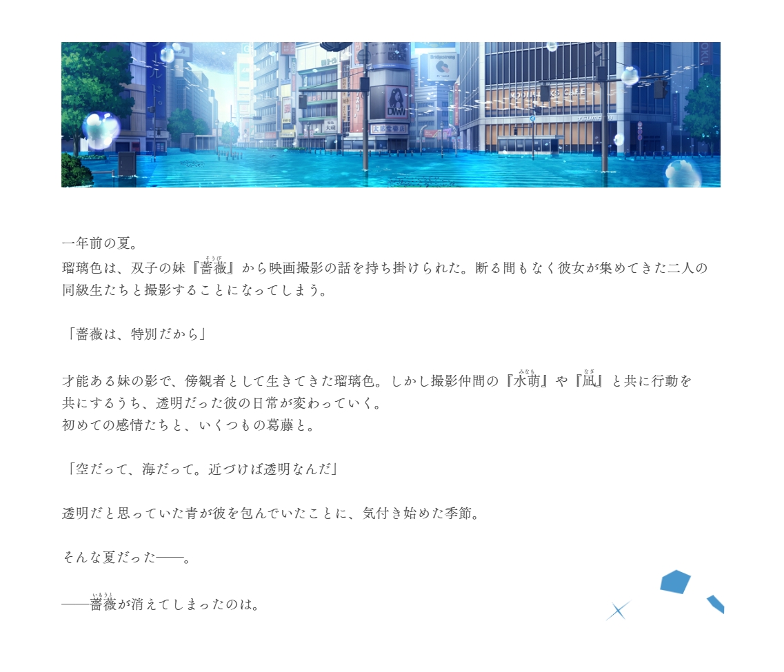 本作の主人公は、3年生となって学生最後の夏を迎えようとしている少年・瑠璃色(るりいろ)。映画撮影を通じて人生が変わり始めた矢先、突如妹が消えてから1年──。