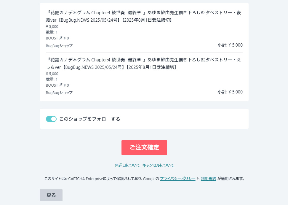 ▲注文内容、支払い方法、届け先などをよく確認して、一番下の「ご注文確定」ボタンを押せば、無事注文完了!! 応募〆切は明日2025年8月1日(金)いっぱいまでに迫っているので、なるだけ急いで応募しよう!!
