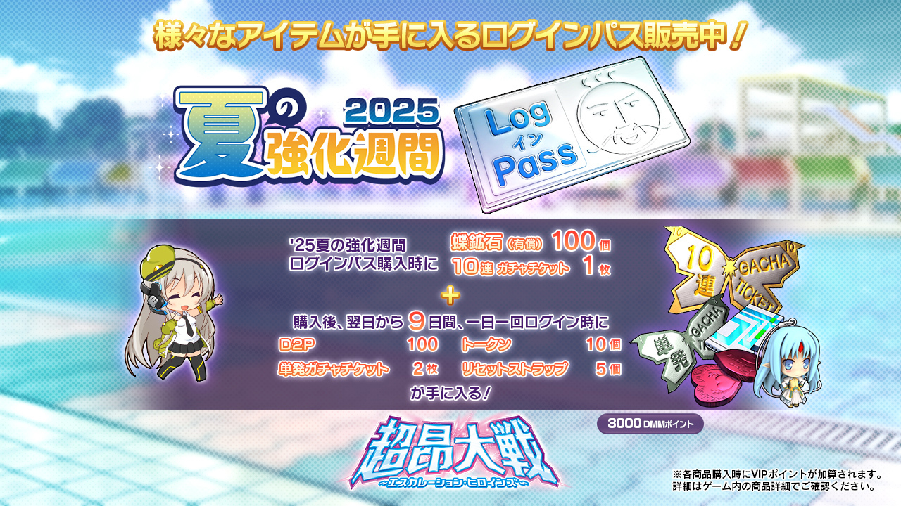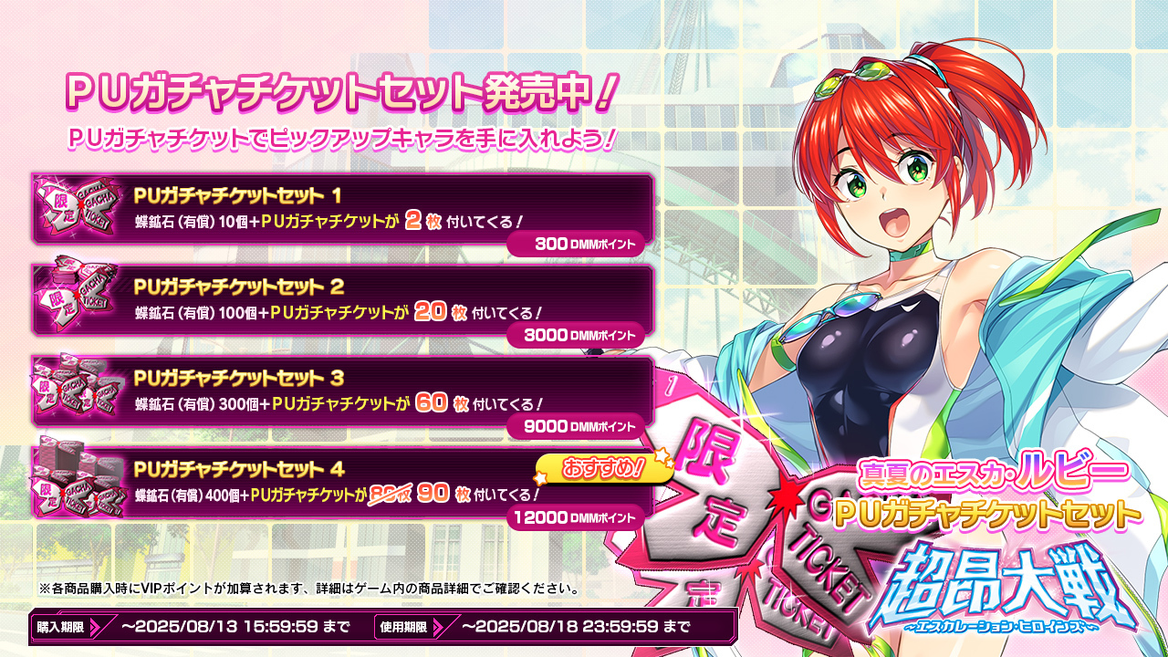ショップではキャンペーン時にはおなじみの無料プレミアムガチャチケットのほか、「2025夏の強化週間ログインパス」や「真夏のエスカ・ルビーPUガチャチケットセット」などの期間限定商品も販売中。