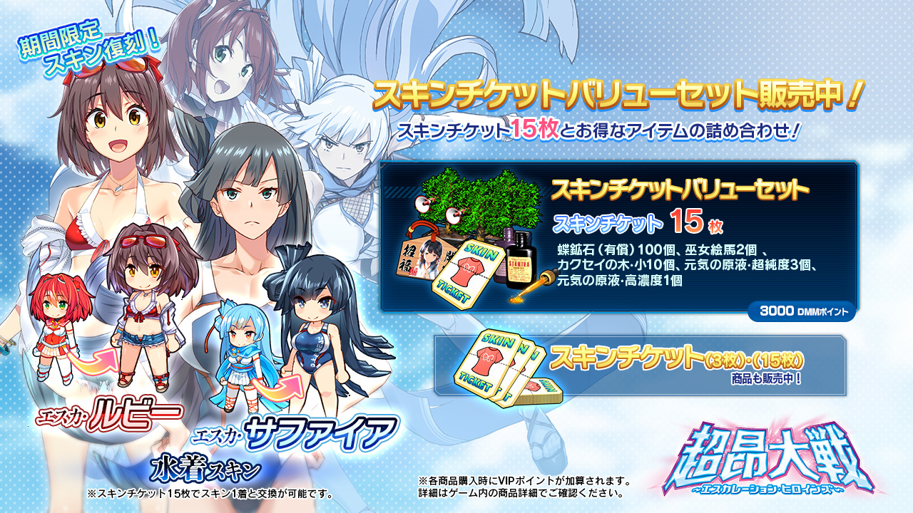 ▲エスカ・ルビーとエスカ・サファイアの水着スキンも期間限定で復刻中。スキンチケット15枚でスキン1着なので、『スキンチケットバリューセット』を購入してもスキン2着とは交換できないことには注意しよう