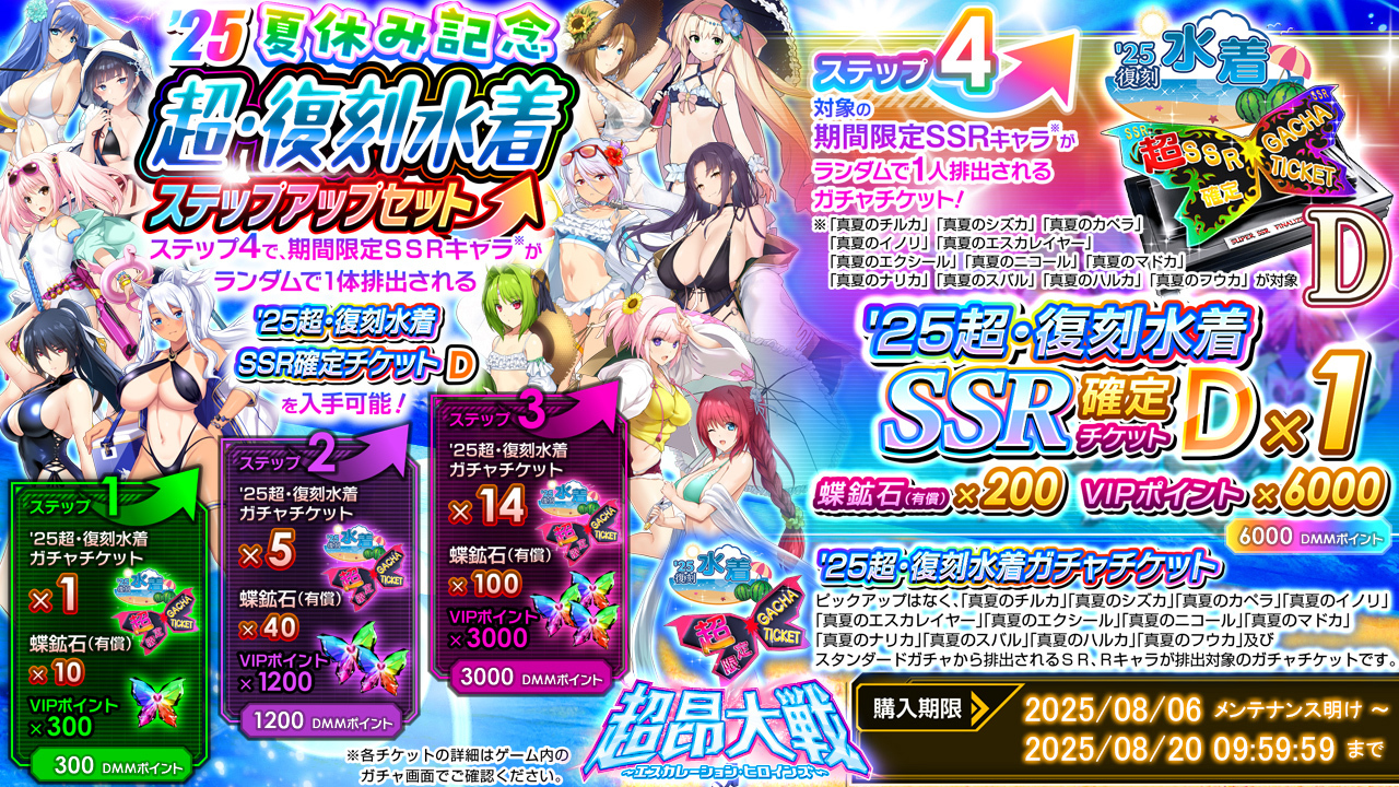 ▲「真夏」系キャラクターを揃えたい人には狙い目の『'25夏休み記念 超・復刻水着ステップアップセット』