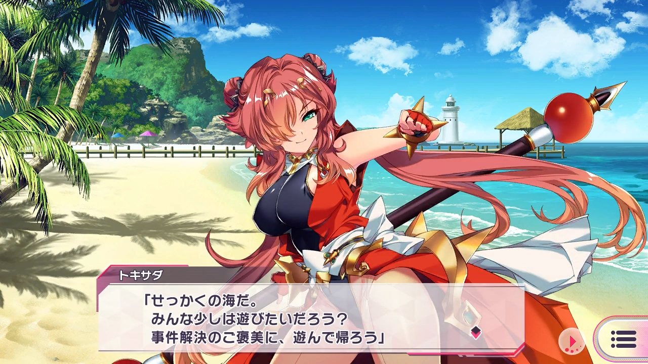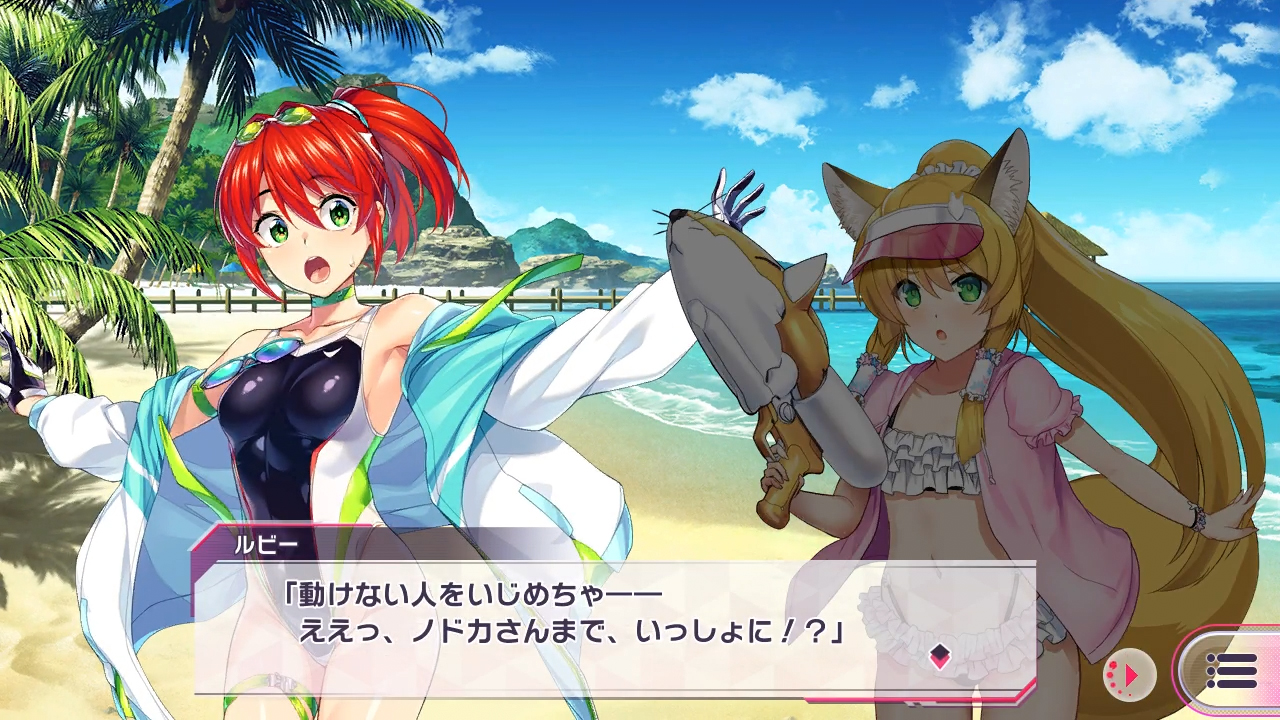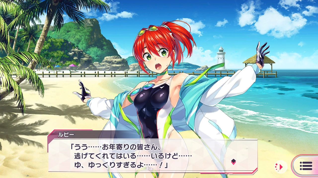 海辺での任務用に用意された、競泳水着衣装のエスカ・ルビー。