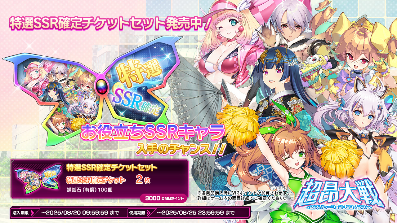 また、夏とは関係ないがコスパに優れた特選SSR確定チケットセットも要チェック。3000DMMポイントで特選SSR(6キャラのいずれか)が確定するチケット2枚+超鉱石(有償)100個。まだ初めて日が浅く戦力が足りていない人には特にオススメ。