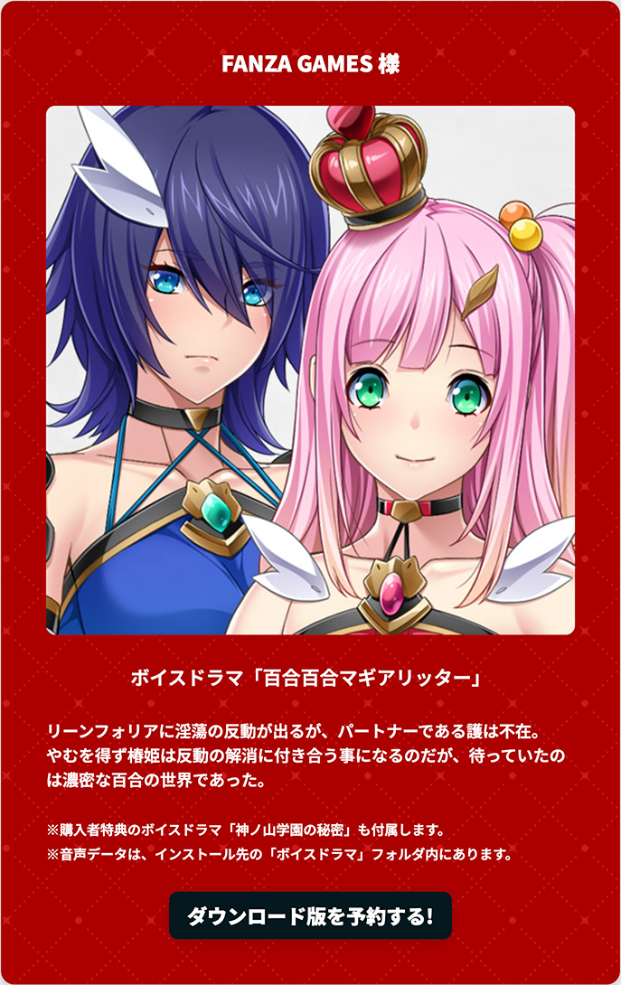 『魔法騎士リーンフォリア』のDL版、パッケージ版を問わず、ボイスドラマ「神ノ山学園の秘密」がプレゼントされる。
