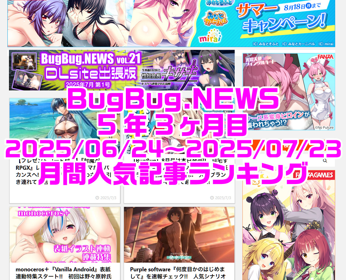 関連記事 久々にやってもーた!! 先月分を掲載し忘れていたので4/24〜5/23 & 5/24〜6/23の月間人気記事ランキング・2ヶ月分をまとめて紹介!! 恒例の月間人気記事ランキングを発表していきく ... BugBug.NEWS 5周年とGW商戦の直前!! 皆によく読まれていた記事は? 3/24〜4/23の月間人気記事ランキング 去る4/24(木)でBugBug.NEWSは祝・5周年!! さらに翌日の4 ... 人気美少女ゲーム最新作の独占スクープ記事にも注目!! 2/24〜3/23の月間人気記事ランキング 今月4/24(木)でBugBug.NEWSは祝・5周年!! 昨年の4周年記念では人気メーカーの描き下ろ ... 美少女ゲーム発のソーシャルゲームが相変わらずの大人気!! 01/24〜02/23の月間人気記事ランキング お正月モードも一段落し、いよいよ2025年が本格稼働してきた1月24日~2月23日の月間人気記 ... 年末年始でまったりしているとムラムラしてきてヌキゲーが人気に!? 12/24〜01/23の月間人気記事ランキング 間にお正月休みを挟んだ12月24日~1月23日の月間人気記事ランキングを紹介。実家に帰 ... 年間人気記事ランキングも要チェック!! 11/24〜12/23の月間人気記事ランキング 年明け早々の1月3日に年間人気記事ランキングを発表したが、いつもの月間人気記事ランキングもこっそり紹介。 11月 ...
