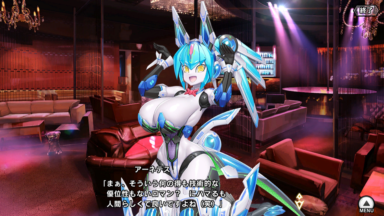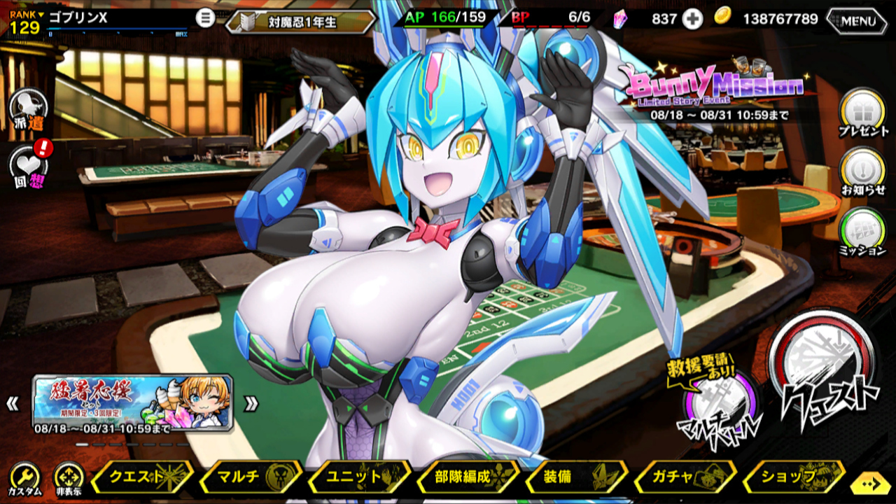 ▲メニューの裏のアジト画面。イベントではパーティでバニーの格好をしていただけだったので、アーネテスをちゃんとカジノで働かせてあげた。腰ほっそ