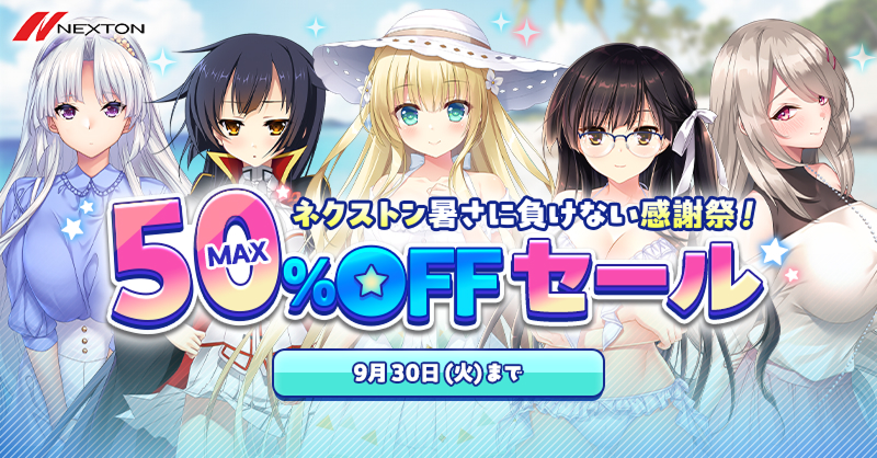 8月29日(金)~9月30日(火)23:59まで、FANZA GAMESで『ネクストン暑さに負けない感謝祭!』が開催。期間中は最大50%OFFや、1本単価1千円になるまとめ買いなどで、ネクストンブランド関連をお得に購入できる。