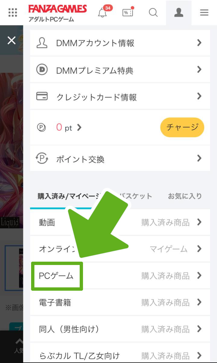 ▲購入完了後は虫眼鏡アイコンの右にある、人型アイコンより「購入済み/マイページ」の「PCゲーム」をタップする