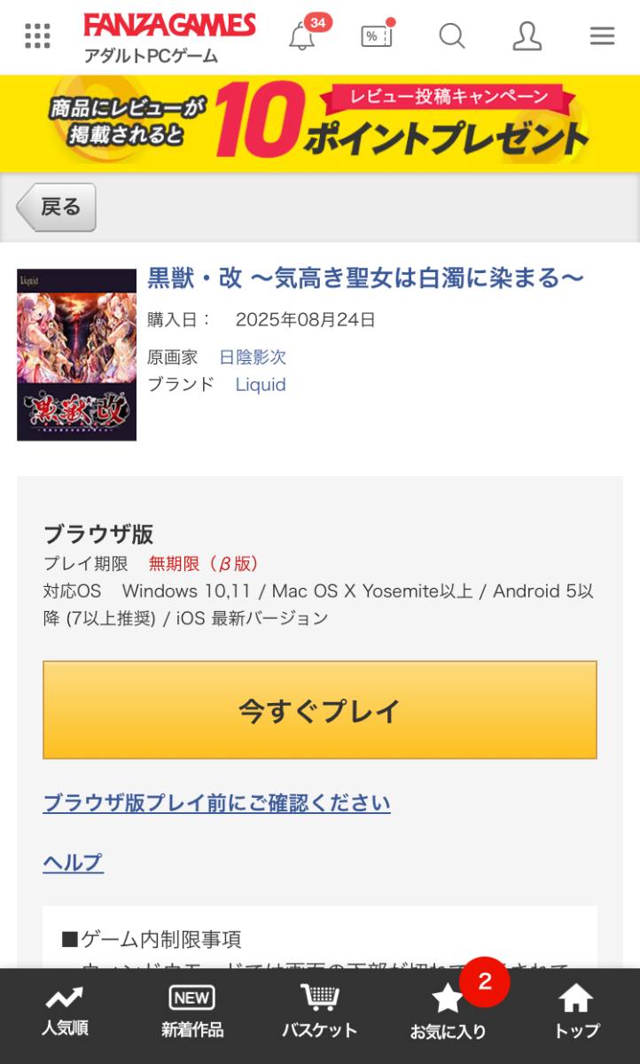 場所を選ばず遊べるブラウザ版はFANZA GAMESのユーザー登録をしていれば誰でも利用可能だ。インストール作業が不要なので、買ってすぐに遊べるのは魅力。本記事では『黒獣・改 〜気高き聖女は白濁に染まる〜』のプレイレポートを紹介していこう。