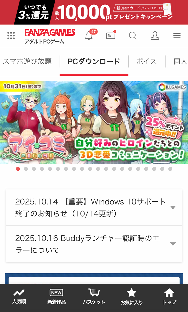 ▲まずはブラウザでFANZAの「PCゲーム」トップ画面を開く。右上の虫眼鏡アイコンから作品を検索だ。総合トップ画面で検索してもOK