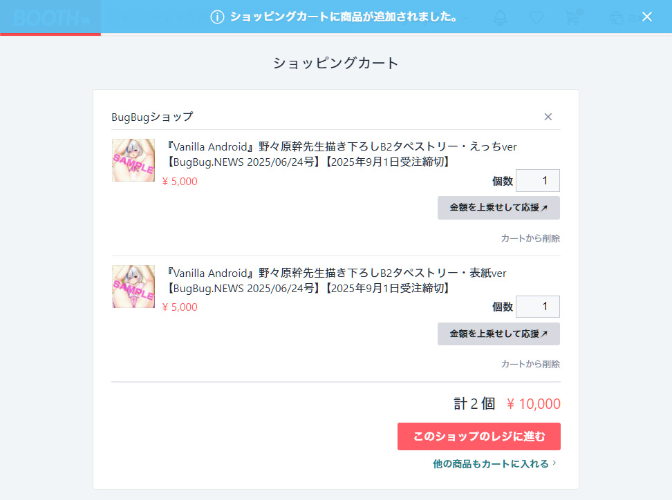 ▲「予約注文する」のボタンを押すと「ショッピングカート」のページに移る。「他の商品もカートに入れる」のリンクを押して、「表紙ver」と「えっちver」両方同時に「ショッピングカート」に入れる事も可能だ。欲しい商品と個数がカートに正しく入ってるのを確認したら、「このショップのレジに進む」ボタンを押して進もう