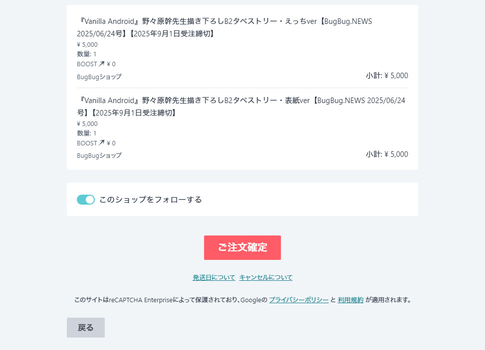▲注文内容、支払い方法、届け先などをよく確認して、一番下の「ご注文確定」ボタンを押せば、無事注文完了!! 応募〆切はもう日付も変わって明日の2025年9月1日(月)いっぱいまでなので、なるだけ急いで応募しよう!!