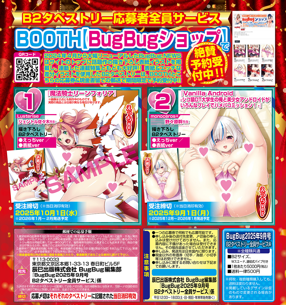 その表紙イラストを使用した「表紙ver」と、すっごくエッチになった差分イラストを使用した「えっちver」、2種類のB2タペストリーを、BOOTH・【BugBugショップ】で、期間限定で予約受付中!! BugBug9月号(8/1発売)でも、本誌の誌面に付いた応募券と現金書留を使って応募を受付中だ。その応募締切が、深夜0時を回って日付も変わり、いよいよ明日9月1日(月)に迫ってきたぞ!!