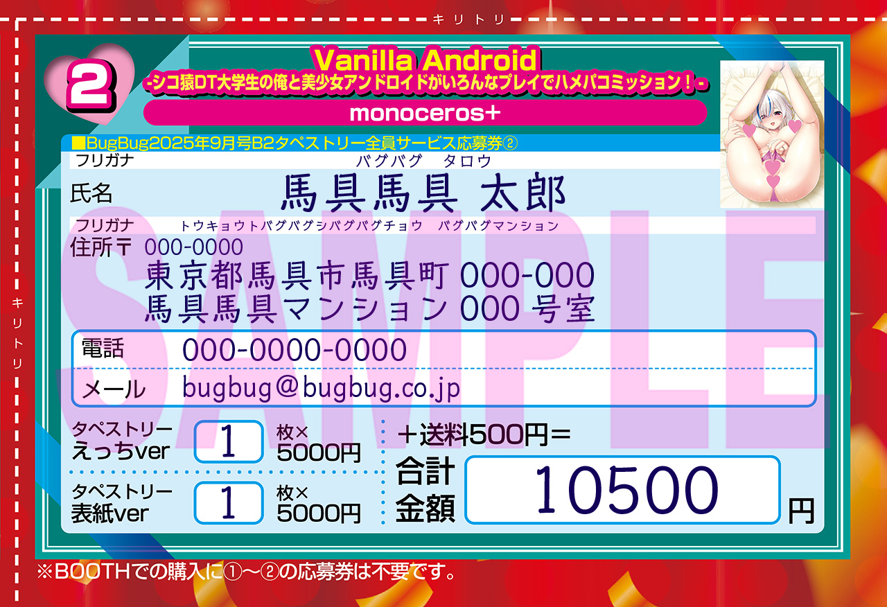 BugBug.NEWSで06/24号の表紙を飾った『Vanilla Android』の描き下ろしイラストを使用した「表紙ver」&「えっちver」2種類のB2タペストリーは、現金書留に本誌の応募券を入れて注文する、従来通りの応募方法でも受付している。