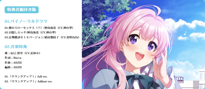 人気美少女ゲームメーカー・CUFFSの音声作品ブランド・Clover Voice。その派生ゲームブランドであるClover GAMEが、第4弾となる新作『やりなおしクランクイン』を発表。音声作品の経験を活かして制作されているだけあってボイスには並々ならぬこだわりがあり、「特典付き限定版」にはエッチなバイノーラルドラマが3本も付属するのが特徴だ。