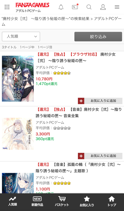 ▲検索欄に「はい」まで入力すると『廃村少女[弐] ~陰り誘う秘姫の匣~』が候補に出てくる。サントラや主題歌もダウンロード販売されているので、気になる方は是非