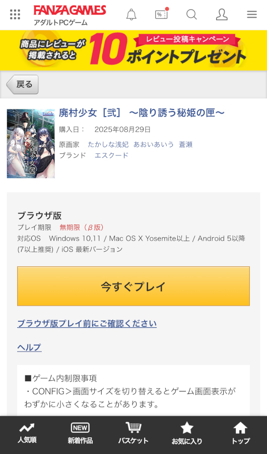 ▲作品ページに飛んで「今すぐ購入する」ボタンをタップ。プレイ環境の確認は忘れずに