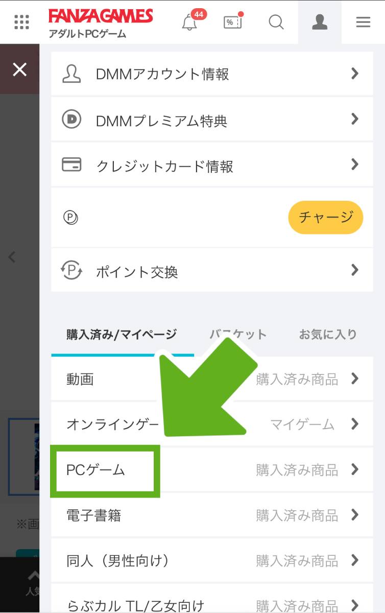 ▲購入完了後は虫眼鏡アイコンの右にある人型アイコンから、「購入済み/マイページ」の「PCゲーム」をクリック