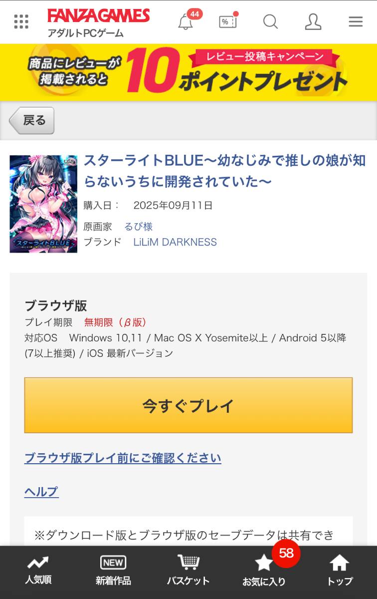 ここからはブラウザ版の購入からプレイまでの手順の説明をしていこう。事前準備はFANZA GAMESのユーザー登録だけ。後はクレジットカードで作品を購入すればオッケーだ。それでは、例として今回紹介した『スターライトBLUE〜幼なじみで推しの娘が知らないうちに開発されていた〜』を購入していく。詳しくは下の画像を参考にしてほしいが、初心者でも簡単に購入~プレイできるぞ。