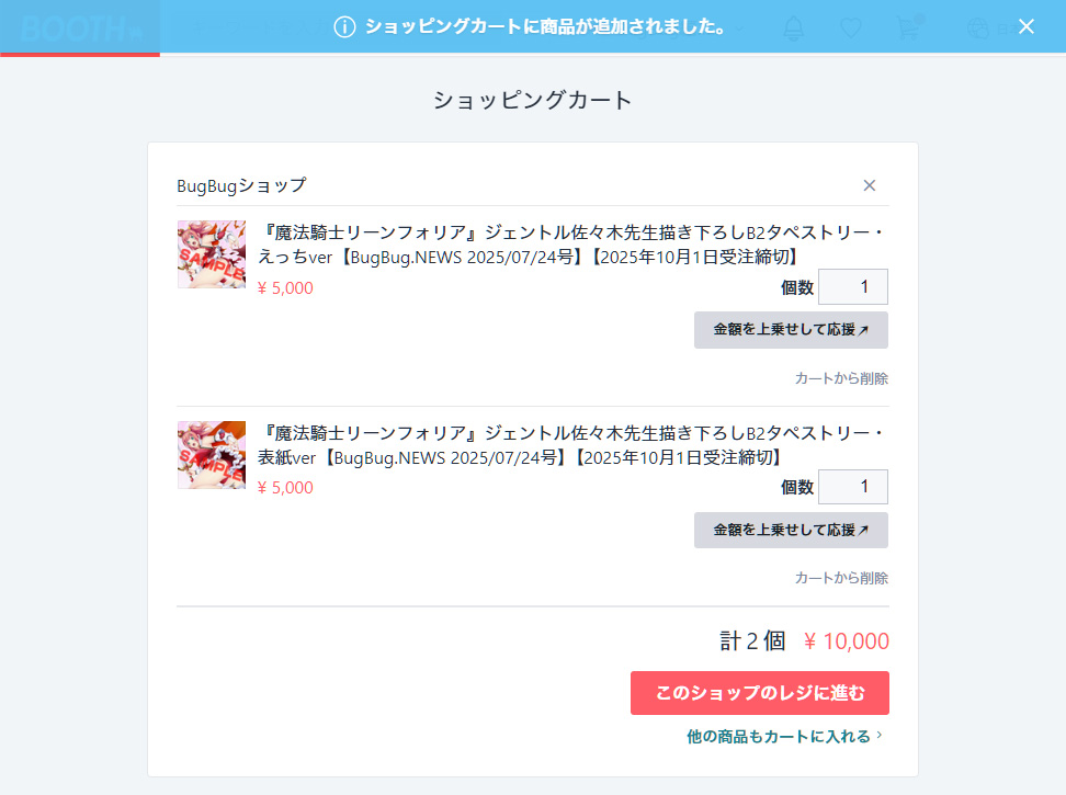▲「予約注文する」のボタンを押すと「ショッピングカート」のページに移る。「他の商品もカートに入れる」のリンクを押して、「表紙ver」と「えっちver」両方同時に「ショッピングカート」に入れる事も可能だ。欲しい商品と個数がカートに正しく入ってるのを確認したら、「このショップのレジに進む」ボタンを押して進もう