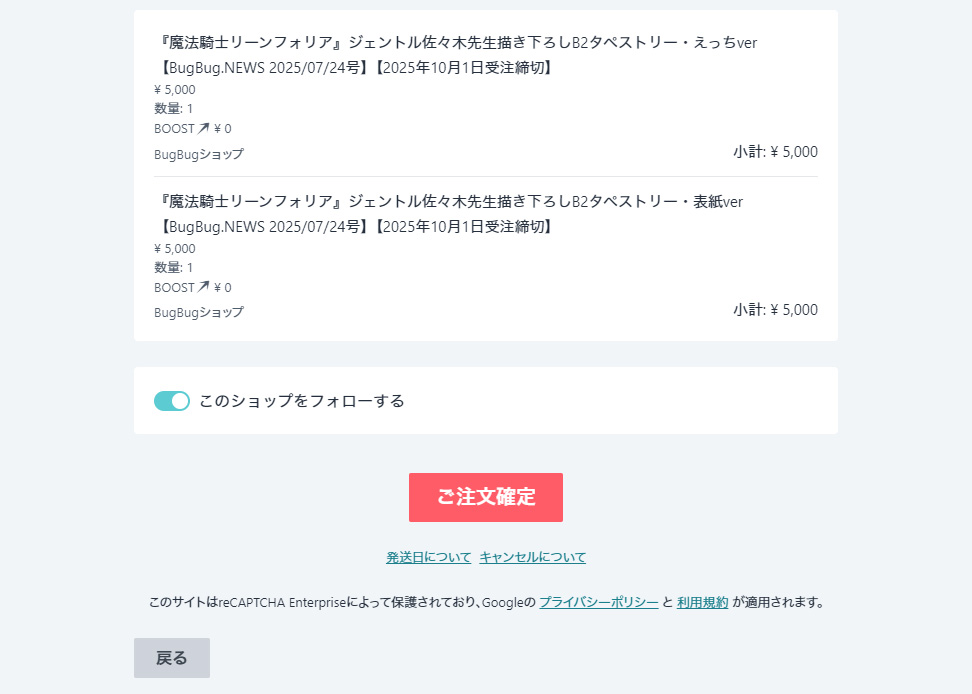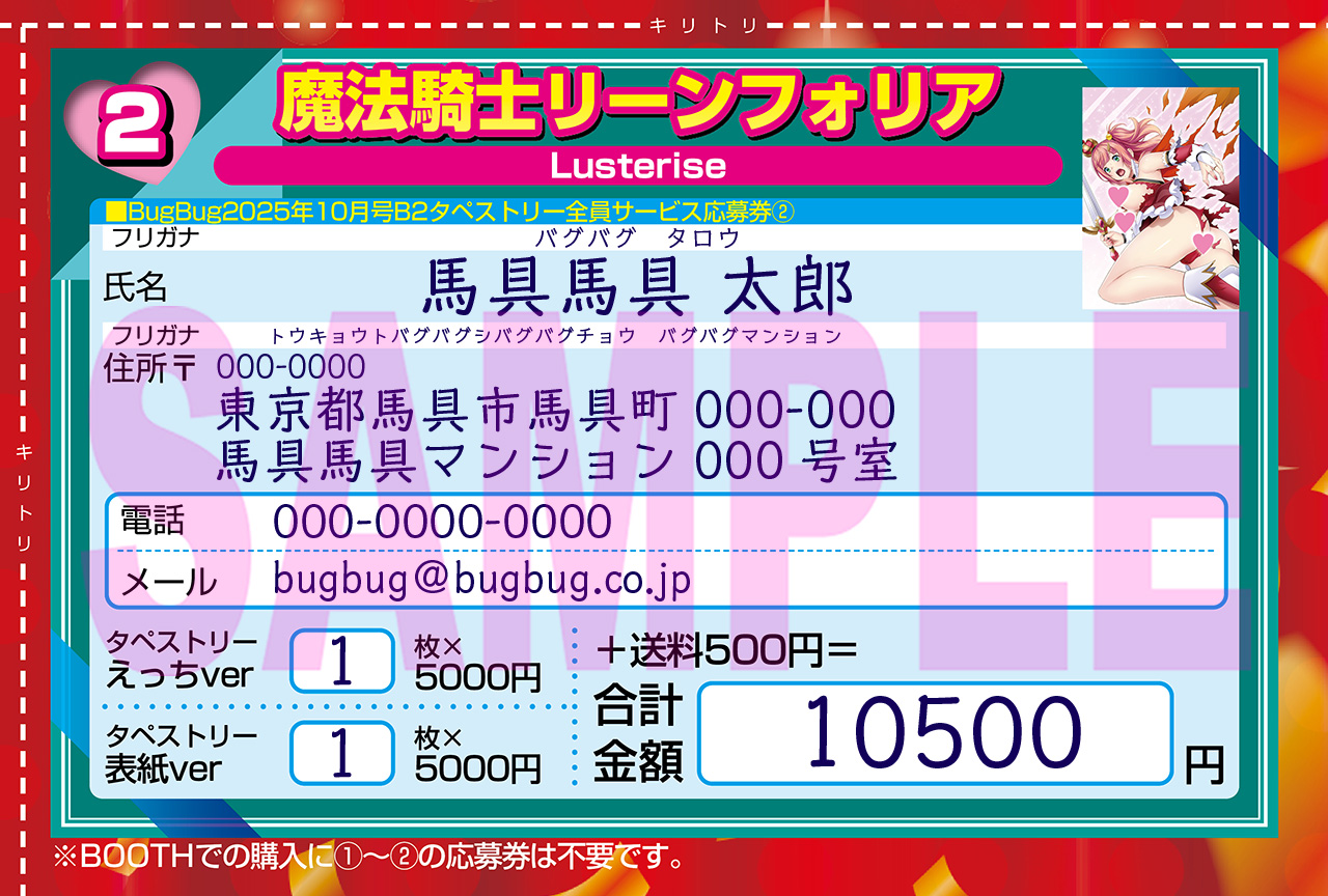 BugBug.NEWS・2025/07/24号の表紙を飾った『魔法騎士リーンフォリア』の描き下ろしイラストを使用した「表紙ver」&「えっちver」2種類のB2タペストリーは、BugBug本誌10月号(9/3発売)と9月号(8/1発売)に付いた現金書留に本誌の応募券を入れて注文する、今まで通りの応募方法でも受け付けている。